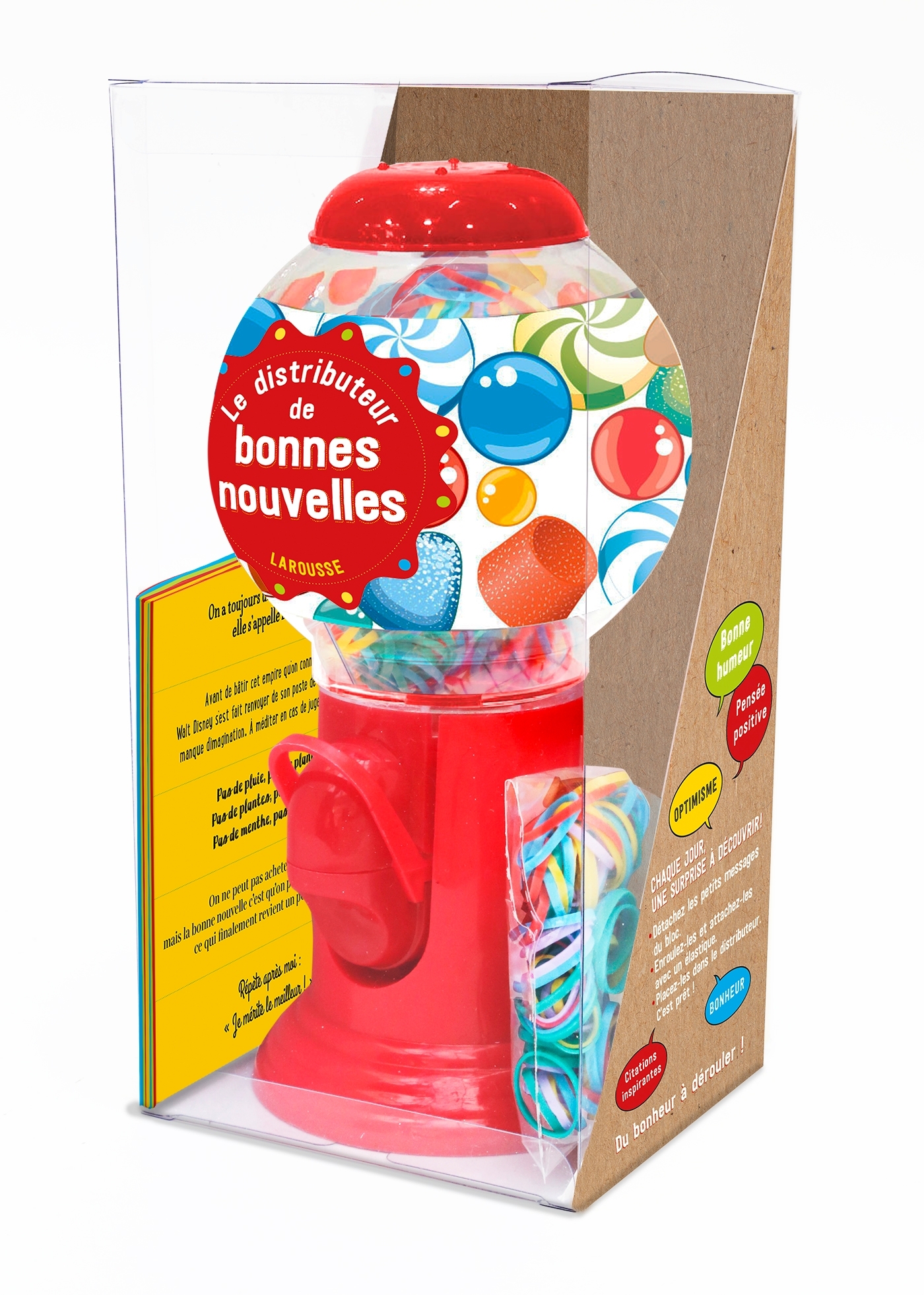 Chaque jour, une surprise à découvrir pour faire le plein de bonheur ! Doux, drôle, étonnant… Quel message allez-vous piocher ? Découvrez dans ce coffret : 1 véritable distributeur + 200 messages à découvrir ou à personnaliser + 2 sachets d’élastiques pour les maintenir. Le mode d’emploi : 1. Détachez les petits messages du bloc. 2. Enroulez-les et attachez-les avec un élastique. 3. Placez-les dans le distributeur. C’est prêt !