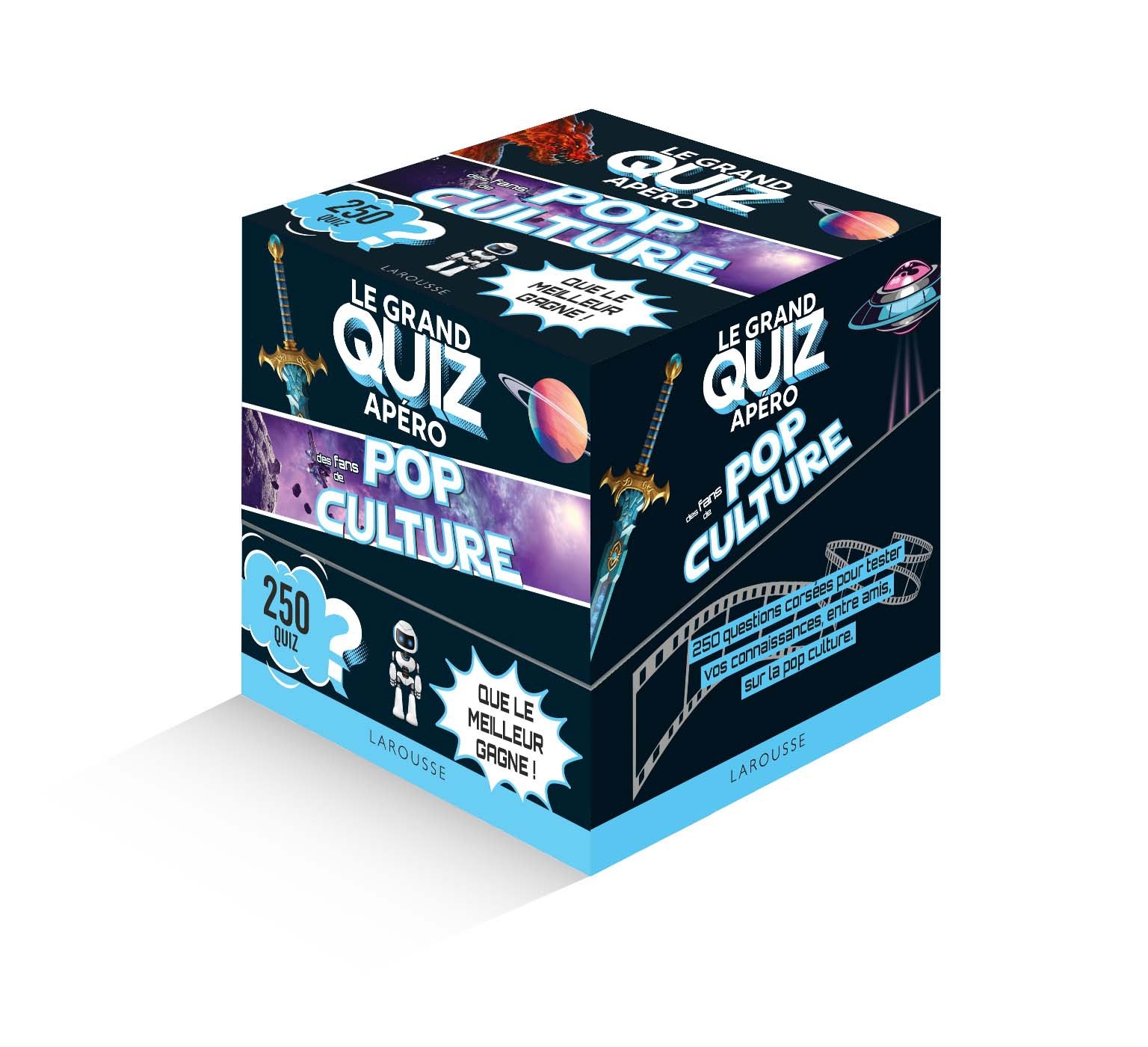Retrouvez 250 questions pour tester vos connaissances entre amis sur la pop culture. Au programme : des quiz, des vrai-faux, des devinettes et des jeux des intrus pour tester ses connaissances sur les romans, séries et films les plus marquants des XXe et XXIe siècles, ainsi que sur les personnages, héros et univers cultes ? Que le meilleur gagne !