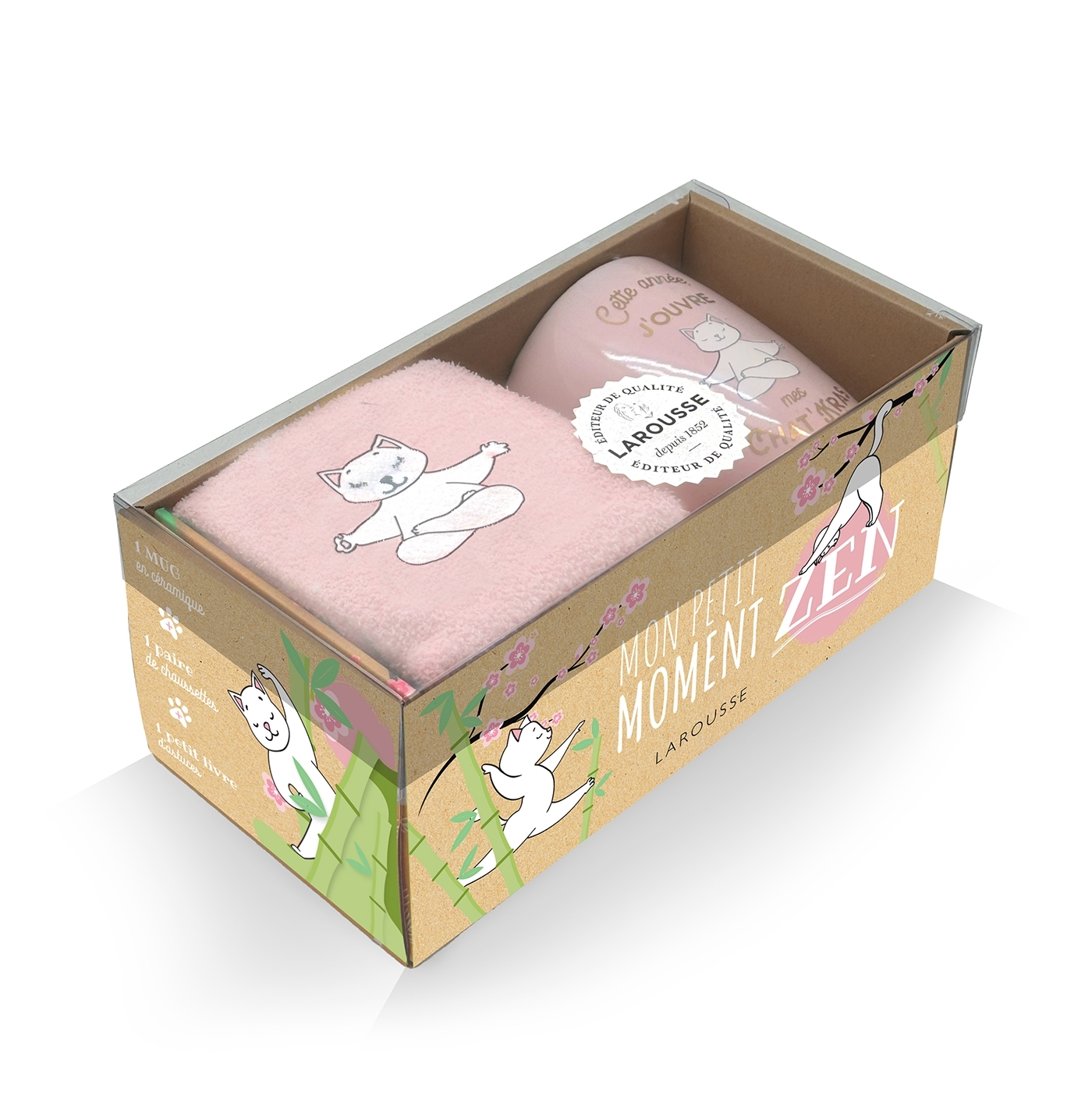 Découvrez dans ce coffret : Un mug en céramique. Une paire de chaussettes chat toutes douces pour passer un hiver cocooning à la maison (taille du 37 au 42). Un petit livre d’exercices : stretching, yoga, sophrologie et méditation en compagnie de Maître Chat, pour un vrai moment de relaxation !