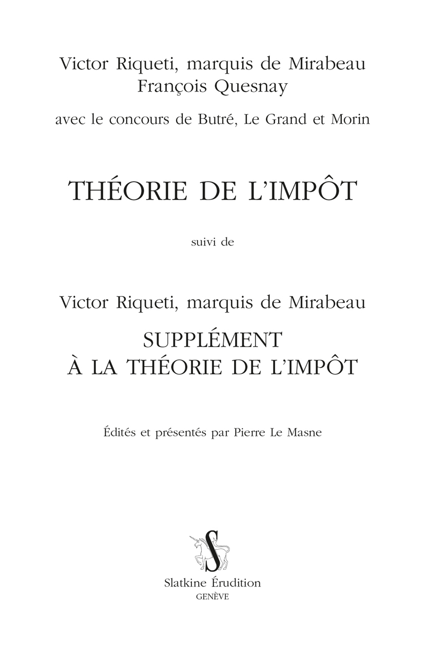 Ce volume re-donne au public, dans une édition critique assortie de notes et d’explications, deux ouvrages liés entre eux : la Théorie de l’impôt (1760) du marquis de Mirabeau et de François Quesnay (avec le concours de Butré, Le Grand et Morin), et le Supplément à la Théorie de l’impôt (1776) du marquis de Mirabeau. Le volume permet de comprendre la doctrine économique et fiscale des Physiocrates et son évolution entre 1760 et 1776. La Théorie de l’impôt est présentée, pour la première fois, avec les annotations de Quesnay sur les manuscrits de l’ouvrage. L’intérêt de ce volume est multiple : – Les deux textes proposent un exposé approfondi sur la doctrine économique et fiscale des Physiocrates. Les auteurs font une critique intéressante du système fiscal français de l’époque et affirment, de façon nouvelle, la nécessité d’un consentement à l’impôt. Le prélèvement fiscal doit être unique, assis sur le seul produit net des propriétaires fonciers. L’impôt ne doit pas frapper la consommation mais seulement le revenu : cette question est encore débattue aujourd’hui. – La Théorie de l’impôt donne un ensemble de tableaux comptables sur l’économie française, une première ébauche des Comptes de la Nation du XXe siècle. Ces tableaux sont supérieurs à ceux de Vauban, et ne seront dépassés que par les Comptes de Lavoisier (qui reprend des données de la Théorie de l’impôt). – Les deux livres ont une dimension historique et politique. Les idées physiocratiques restent influentes jusqu’à la Révolution française. Certains principes de la Théorie de l’impôt se retrouvent dans la Déclaration des droits de l’homme et du citoyen de 1789 ou sont encore en vigueur aujourd’hui (comme l’universalité de l’impôt). Le Supplément à la théorie de l’impôt discute du rôle des assemblées locales dans la perception de l’impôt et est relié au Mémoire sur les Municipalités de Dupont et Turgot.