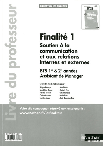 En Finalité 1, 1re et 2e années de BTS, la collection les Finalités propose une démarche inédite : - confronté à des situations professionnelles complexes, l'étudiant, futur assistant de manager, est guidé progressivement dans la résolution du problème professionnel qui lui est soumis ; - les outils, connaissances et compétences indispensables à la résolution des cas lui sont fournis au fur et à mesure de ses besoins, par des fiches ressources. Le livre du professeur propose les corrigés de toutes les applications ainsi que des cours complémentaires. Le site compagnon propose gratuitement les corrigés de toutes les applications et des cours complémentaires sous format Word personnalisable, des enregistrements de dialogues et le manuel numérique vidéoprojetable.