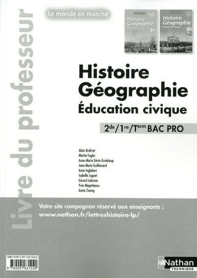 Dans la collection Le monde en marche, le livre du professeur est commun pour les ouvrages d'Histoire - Géographie - Éducation civique 2e et 1re/Term Bac Pro. Il propose des compléments pour présenter les documents, des pistes de mise en œuvre pédagogique, des choix de problématiques et le corrigé de tous les exercices.