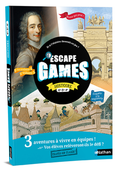 Et si l'Histoire devenait un jeu ?... Avec la pochette d'Escape Games Histoire, plongez vos élèves dans trois aventures passionnantes à vivre en équipes pour découvrir des époques historiques de façon ludique ! INFORMATION: Une petite erreur s'est glissée dans la fiche de mise en commun du jeu de 5e, " Enquête à la seigneurie ". Téléchargez la fiche corrigée sur le site compagnon de la pochette. Vous pouvez aussi la retrouver dans la version numérique de votre pochette. Thèmes des jeux : --- 6e > Rome qui peut ! Vos élèves partent à la découverte de la Rome antique avec une mission : démêler ce qui relève du mythe et ce qui relève de l'histoire. ● Chapître en lien : Rome, du mythe à l'histoire 5e > Enquête à la seigneurie Vos élèves découvrent des lieux et des personnages qui peuplent la seigneurie. ● Chapître en lien : L'ordre seigneurial : formation et domination des campagnes 4e > La Confrérie Voltaire Vos élèves, membres d'une confrérie secrète, remontent le temps pour que Voltaire accomplisse sa destinée. ● Chapître en lien : L'Europe des Lumières La pochette d'Escape Games Histoire 6e/5e/4e contient : ♦ Un KIT PÉDAGOGIQUE avec : 1/ un guide complet pour vous accompagner dans la mise en place des jeux • La présentation détaillée de tous les supports • Les enjeux et apports pédagogiques • La mise en pratique en classe • Le déroulé pas à pas de chaque jeu • Des pistes de prolongements • Les scripts des audios et vidéos 2/ Des fiches photocopiables • 6 feuilles de route par jeu pour guider les élèves dans la résolution des énigmes • Des documents supplémentaires à distribuer au fil des jeux ♦ 18 PLATEAUX DE JEUX • Chaque jeu comporte 6 plateaux différents (format A3) pour faire jouer 6 équipes. Les élèves s'appuient sur des documents (textes, audio, vidéo) pour résoudre les énigmes. • L'appli Nathan live! permet aux élèves de scanner le plateau de jeu avec une tablette ou un téléphone pour accéder aux documents audio ou vidéo. + La VERSION NUMÉRIQUE L'ensemble des ressources pour chaque jeu (dont des vidéos "teaser" pour plonger les élèves dans l'ambiance de chaque jeu) disponible en version numérique pour projeter en classe, ou pour jouer sans smartphone/tablette. Vos élèves relèveront-ils le défi ?...