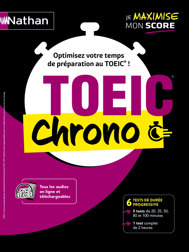 Une préparation efficace et complète pour optimiser son temps de préparation au TOEIC® et maximiser son score ! Cet ouvrage permet un entraînement simple et progressif au TOEIC®. Que vous ayez 20 minutes ou 2 heures devant vous, entraînez-vous aux 7 parties du test ! Pour tous les " candidats pressés " : une préparation optimale et facile à utiliser. 5 tests de durée progressive : en 20, 35, 50, 80 et 100 minutes 1 test blanc complet (2 heures) Tous les corrigés détaillés ciblant les difficultés principales (mots de vocabulaire, expressions, points grammaticaux, etc.) Des conseils et astuces méthodologiques pour réussir le test le jour J. Tous les audios sont directement accessibles sur votre smartphone grâce aux QR-Codes ou téléchargeables en mp3 sur le site www.nathan.fr/toeic-chrono -01 . Les audios sont disponibles avec différents accents : américain, britannique, canadien et australien. Des auteurs experts du sujet ! Philippe Hermelin est le cofondateur d'un organisme de formation professionnelle. Passionné de pédagogie, il enseigne l'anglais en entreprise et en école de commerce et prépare régulièrement ses étudiants au test TOEIC® à travers l'élaboration de parcours pédagogiques personnalisés. Serena Murdoch Stern , britannique, est formatrice d'anglais en France, spécialisée en anglais des affaires et enseignante dans de grandes écoles parisiennes. Auteure de nombreuses méthodes de langue à succès, elle vous fait bénéficier de son expérience acquise auprès des candidats individuels et étudiants passant le TOEIC®.