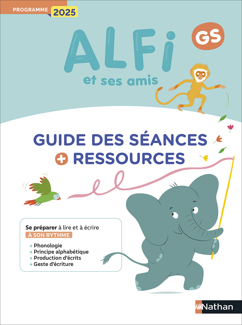 Ce guide des séances et ressources GS présente les principes didactiques et pédagogiques de la méthode Alfi et ses amis pour la GS. Les principes didactiques et pédagogiques de la méthode. La programmation complète sur l'année avec un emploi du temps type pour organiser les différents temps d'activités. Le déroulé des séances semaine par semaine. Les fiches de mise en œuvre des séances types avec les conseils et les gestes professionnels assurant un guidage efficient. Les ressources à manipuler : images mots, planches de jeux, posters des histoires, feuilles de route du Parcours Alfi en autonomie à personnaliser, etc. Une entrée par l'oral pour aller progressivement vers l'écrit La méthode articule les domaines du programme 2025 qui préparent à la lecture et à l'écriture, de manière cohérente et ludique. La programmation prévoit des réactivations régulières et croisées pour faire des allers-retours constants entre son de la lettre, nom de la lettre et geste d'écriture. Pour chaque période : une histoire originale d'Alfi, illustrée par un poster, pour suivre notre petit héros dans sa vie quotidienne et s'immerger dans son univers. Pour chaque semaine : une comptine d'Alfi comme support du rituel quotidien : jeux phonologiques sur les mots, les syllabes et les phonèmes (jours 1 et 2), jeux articulatoires (jour 3), réalisation collective de la maison du son de la semaine et dictée à l'adulte pour faire le lien entre la forme orale de la comptine mémorisée et sa forme écrite (jour 4). Pour chaque jour de la semaine : des ateliers tournants dirigés et semi-dirigés pour se préparer à apprendre à lire et à écrire. Un atelier dirigé consacré à l'apprentissage du geste d'écriture avec Mon premier cahier d'écriture. Au rythme de chaque enfant : le Parcours Alfi donne des pistes d'ateliers autonomes pour permettre à chacun de s'entrainer et de suivre ses progrès avec des feuilles de route de niveaux progressifs, matérialisés par des couleurs. En fin de période : un rebrassage pour réactiver et renforcer les apprentissages.