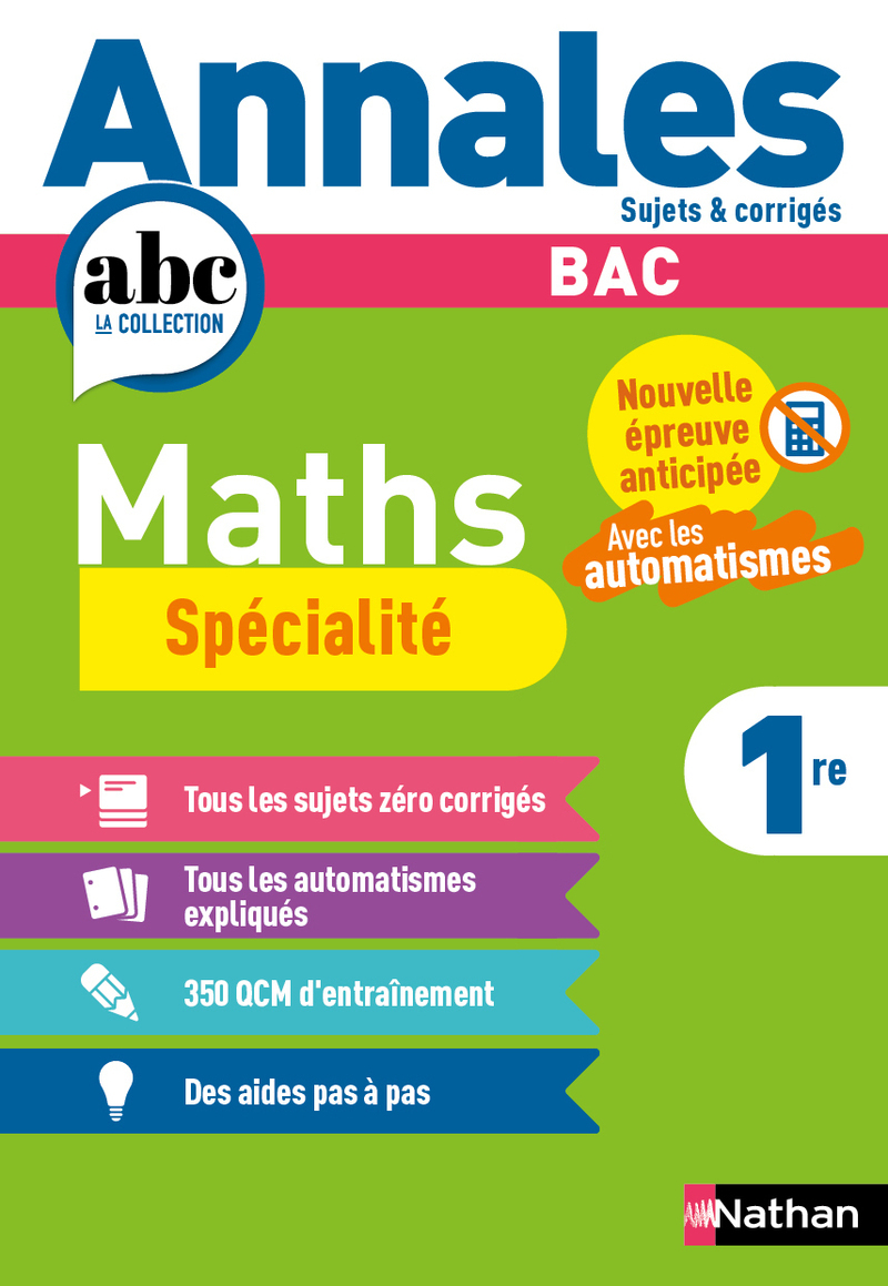 Les Annales ABC du Bac pour préparer la nouvelle épreuve anticipée de Mathématiques en Première du Bac 2026 > sujets de l'épreuve de spécialité , pour les élèves ayant choisi la spécialité Mathématiques. Sujets corrigés et commentés - Tous les sujets zéro corrigés pour préparer l'épreuve - Tous les automatismes expliqués - 350 QCM d'entraînement - Des aides pas à pas et la méthode en contexte
