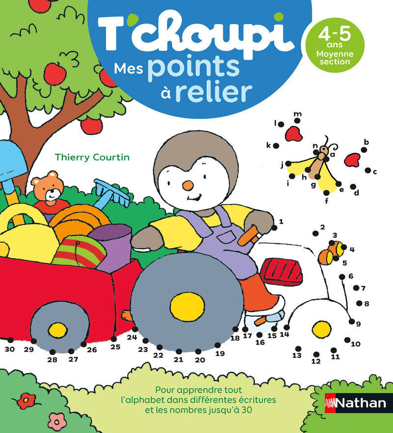 Un cahier T'choupi pour apprendre en s'amusant : 23 points à relier pour mémoriser l'alphabet et les nombres jusqu'à 30, développer le geste d'écriture et gagner en confiance à la maison. Avec T'choupi, l'apprentissage devient un jeu. 23 activités de points à relier aident votre enfant à mémoriser l'alphabet (majuscules bâtons, minuscules scriptes et cursives) et les nombres jusqu'à 30, tout en entraînant le geste du tracé. > Idéal pour la Moyenne Section (4-5 ans). Points forts - 23 jeux progressifs pour relier les points et réussir chaque tracé. - Alphabet complet dans différentes écritures - Chiffres de 1 à 30 - Frise de l'alphabet et bande numérique pour guider l'enfant. - Format cahier rapide et ludique : séances de 10–15 min, à la maison ou en classe. Bénéfices pédagogiques - Développe la motricité fine et la coordination œil-main (préparation à l'écriture). - Automatise les gestes de base du graphisme (lignes, courbes, changements de direction). - Renforce la reconnaissance des lettres et l' ordre alphabétique . - Installe les premiers repères numériques (compter jusqu'à 30).