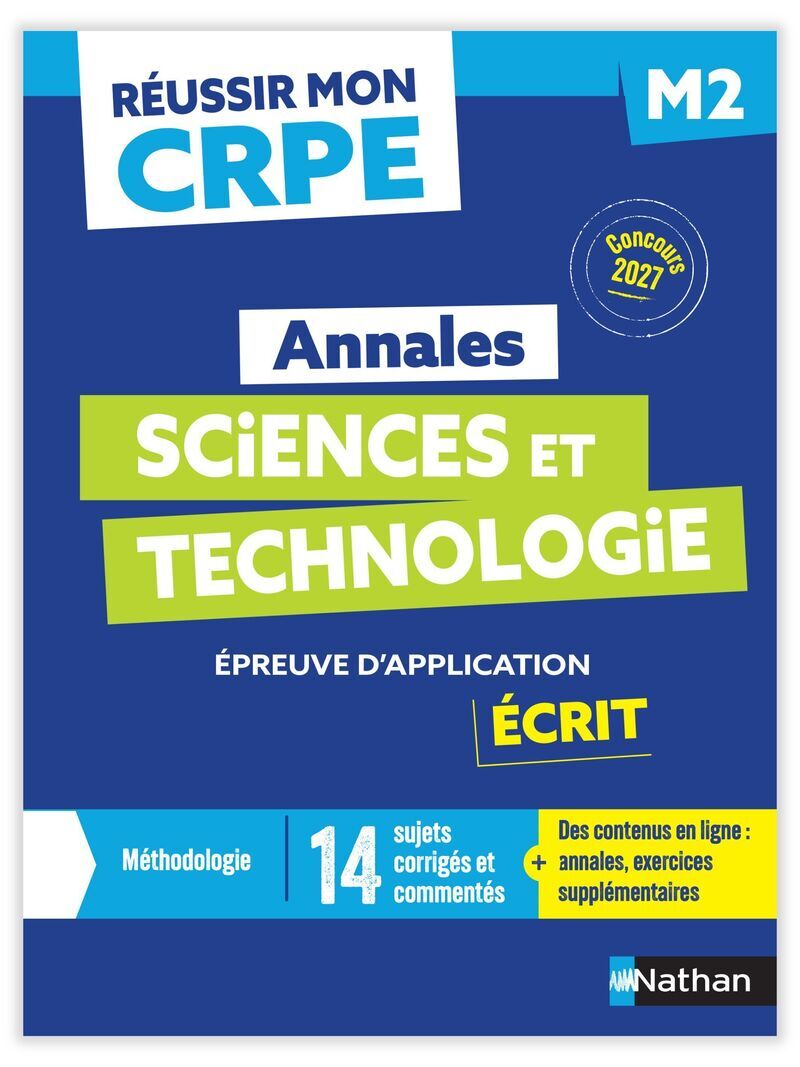 Découvrez les annales de l'épreuve d'admissibilité Sciences et technologie - M2 - Écrit 2027. Cet ouvrage permet de préparer et réussir le Concours de Professeur des Écoles (CRPE). Descriptif Cet ouvrage correspond aux domaines de l' épreuve écrite d'admissibilité en Sciences et technologie​. • Tous les thèmes du programme abordés. • Une préparation didactique adaptée. • Une méthodologie complète. • 15 sujets d'entrainement corrigés et commentés. Points forts • Un ouvrage de formation et de préparation : lecture active via des commentaires en marge des corrigés pour expliquer les choix pédagogiques et didactiques des corrigés​. • Des compléments numériques gratuits. • Corrigés des sujets zéro du ministère.