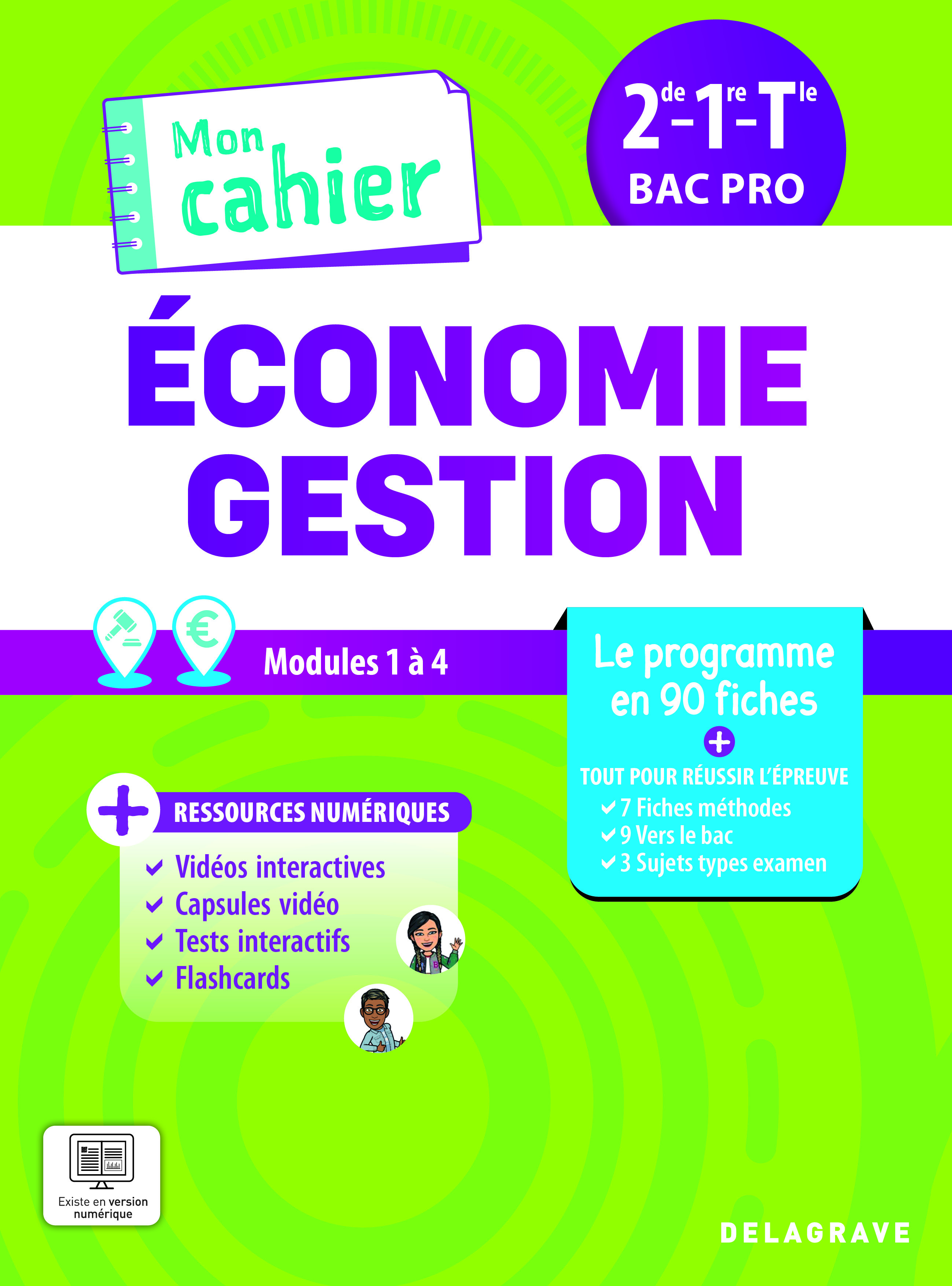 Un cahier innovant, pratique et facile qui révolutionne l’Économie-Gestion par son concept tout-en-un (fiches - exercices - cours - méthodes - révisions), par son approche concrète à partir de situations réelles qui parlent aux apprenants et sa présentation très visuelle pour donner le goût d'apprendre. 90 fiches pour couvrir de manière progressive et efficace tout le programme de 2 de , 1 re et T le (modules 3 à 5) Des contextes originaux choisis parmi les centres d'intérêt des apprenants (Disneyland, Fortnite, Haribo, Futuroscope, McDonald’s) « Mes exos » : des activités faciles à mettre en œuvre pour tester les connaissances et inciter l'apprenant à réfléchir sur les notions étudiées « Je retiens » : des synthèses visuelles et concises pour mémoriser l'essentiel « Méthodo » : 7 fiches méthode simples et guidées + des applications méthode en fin de chapitre pour apprendre à exploiter les différents types de documents « Je révise » : des entraînements sous forme de jeux, à réaliser seul ou en groupe pour réussir les évaluations « Tout pour réussir l'épreuve » : 7 fiches méthodes pour traiter un sujet d'examen, suivies de 3 sujets d'entraînement Des ressources pour chaque phase du cours : apprentissage (vidéos interactives, capsules vidéo pour apporter des éclairages sur les documents, vidéo du cours réalisé par les auteurs pour aider à la compréhension de la synthèse), entraînement (quiz), révision (flashcards)