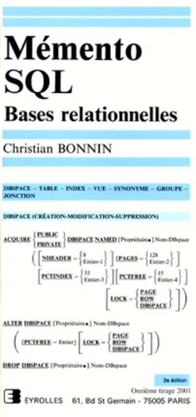 Mémento S.Q.L. - Bases relationnelles. Au sommaire DBSpace - Table - Index - Vue - Synonyme - Groupe - Jonction Les manipulations de données Autorisations et contrôles d'accès Gestion des erreurs SQL (en COBOL) Mise en exploitation de SQL Mise au point avec ISQL Unload-Reload de table et DBSpace