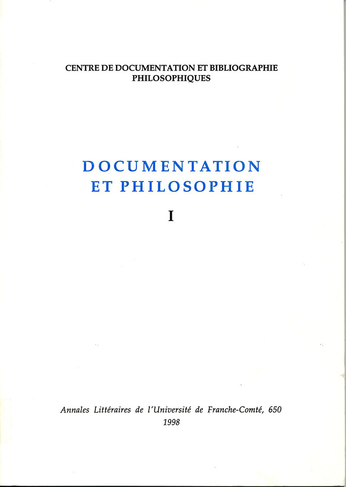 Le Centre de Documentation et Bibliographie Philosophiques avait organisé, fin mai 1994, des Journées d'études dont les Actes ont paru sous le titre « Outils documentaires pour philosophes : Thesaurus, indexation, abstracts » (Annales littéraires de l'Université de Franche-Comté, n° 612, 1996, 159p). En forme de conclusion provisoire (p.153-157), un bilan était brièvement esquissé, ainsi qu'une orientation pour de futures recherches. Le présent volume réunit trois contributions de membres du CDBP, Jean-Pierre Cotten, Benoît Hufschmitt et Marie-Madeleine Varet-Pietri. Ils s'essaient, chacun à partir de leurs préoccupations et de leurs intérêts, de mettre en œuvre, de façon concrète, ce programme de recherche. Toutes remarques, observations, critiques, suggestions pour des thèmes de travaux en commun seront les bienvenues.