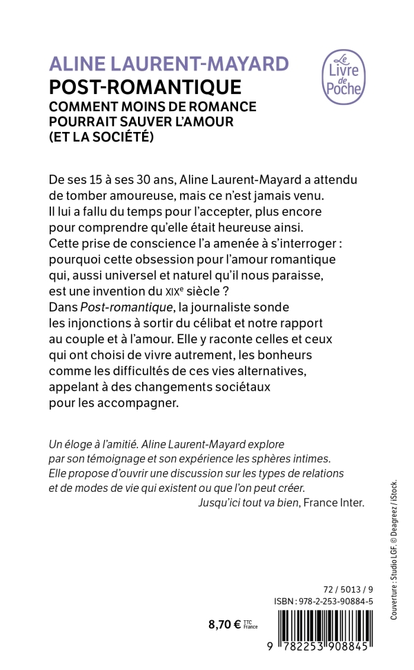 De ses 15 à ses 30 ans, Aline Laurent-Mayard a attendu de tomber amoureuse, mais ce n’est jamais venu. Il lui a fallu du temps pour l’accepter, plus encore pour comprendre qu’elle était heureuse ainsi. Cette prise de conscience l’a amenée à s’interroger : pourquoi cette obsession pour l’amour romantique qui, aussi universel et naturel qu’il nous paraisse, est une invention du xix e siècle ? Dans Post-romantique , la journaliste sonde les injonctions à sortir du célibat et notre rapport au couple et à l’amour. Elle y raconte celles et ceux qui ont choisi de vivre autrement, les bonheurs comme les difficultés de ces vies alternatives, appelant à des changements sociétaux pour les accompagner. Un éloge à l’amitié. Aline Laurent-Mayard explore par son témoignage et son expérience les sphères intimes. Elle propose d'ouvrir une discussion sur les types de relations et de modes de vie qui existent ou que l'on peut créer . « Jusqu’ici tout va bien », France Inter.