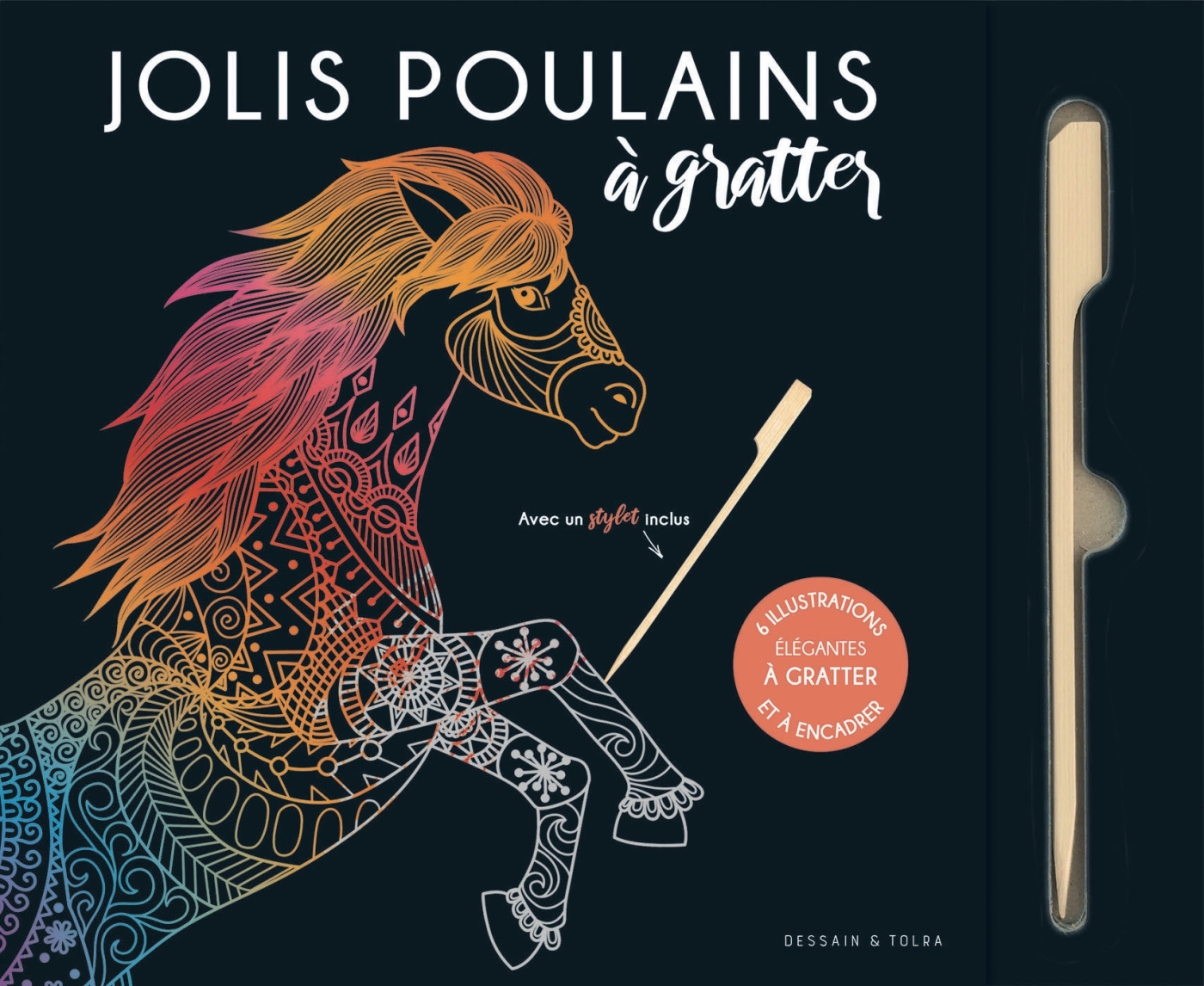 6 illustrations élégantes à gratter et à encadrer ! Gracieux, joyeux, fougueux… découvrez dans ce livre 6 cartes à gratter détachables ornées d’adorables poulains. Choisissez le modèle qui vous inspire et munissez-vous du stylet inclus. Grattez les contours des dessins, leurs fins ornements : ils s’illuminent d’un super dégradé pour un effet coloré ! Au gré de vos envies, enrichissez votre illustration de motifs, de dessins, de textes… Et découvrez quelles nuances se cachent derrière le fond noir. Suivez votre inspiration, tout est permis !
