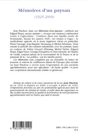 Jean Pinchon, dans ces Mémoires d'un paysan , préfacés par l'ancien ministre Edgar Pisani, évoque une existence entièrement vouée à l'agriculture : l'enfance dans une famille rurale de Normandie, durant les années 1920 ; les études à l'Agro ; le syndicalisme agricole où le jeune ingénieur côtoie, en particulier, Henri Canonge, Jean-Baptiste Doumeng et Michel Debatisse. Vient ensuite la période des cabinets ministériels, avec des portraits hauts en couleur. Ces Mémoires sont compétés par des lettres de jeunesses et des conférences.