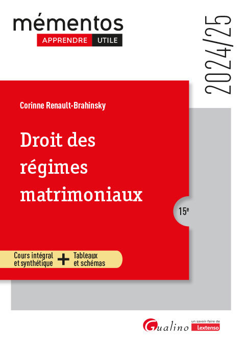 Apprendre plus facilement, plus rapidement, et utile ! Les points forts de cette nouvelle édition Une Compréhension Claire et Structurée : Cet ouvrage traite des règles relatives aux couples mariés et aux partenaires pacsés, ainsi que leurs interactions avec les tiers en offrant une présentation claire et structurée des différents régimes matrimoniaux et de leurs implications. Une Analyse Pratique et Opérationnelle : En plus de présenter les règles théoriques, ce Mémentos offre une analyse pratique et opérationnelle, illustrée par des exemples concrets et des cas jurisprudentiels. L'auteur s'appuie sur de nombreux tableaux, schémas utiles aux étudiants pour appliquer efficacement les principes du droit des régimes matrimoniaux tout au long de leur cursus. Un Outil Indispensable : Ce Mémentos constitue un outil indispensable pour l'étudiant pour une maîtrise complète et à jour du droit des régimes matrimoniaux. Toutes les règles régissant les couples mariés et les partenaires pacsés, tant entre eux qu'avec les tiers.