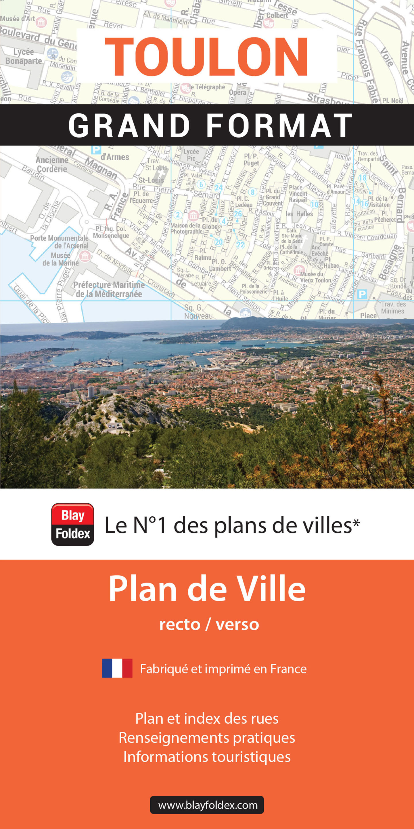 Le plan de ville de Toulon Grand Format est constitué d’un plan plié détachable et d’un index fourni sous forme de livret . Le plan de la ville de Toulon Grand Format indique les principaux sites et monuments à visiter : la Vieille ville, la Cathédrale Sainte-Marie de la Seds, la Place Puget, le Musée d’Art, le Muséeum d’Histoire Naturelle, le Musée Nationale de la Marine, la Tour Royale ou encore le Musée Naval du Fort Balaguier. Ce plan de ville contient l’ensemble des rues avec leur nom, les principaux bâtiments publics et touristiques. Un index complet des rues et des bâtiments vous permet de vous repérer très facilement. Il couvre les communes de Toulon, La Seyne-sur-Mer, Six-Fours-les-Plages, Sanary-sur-Mer, Ollioules, La Valette-du-Var et La Garde .
