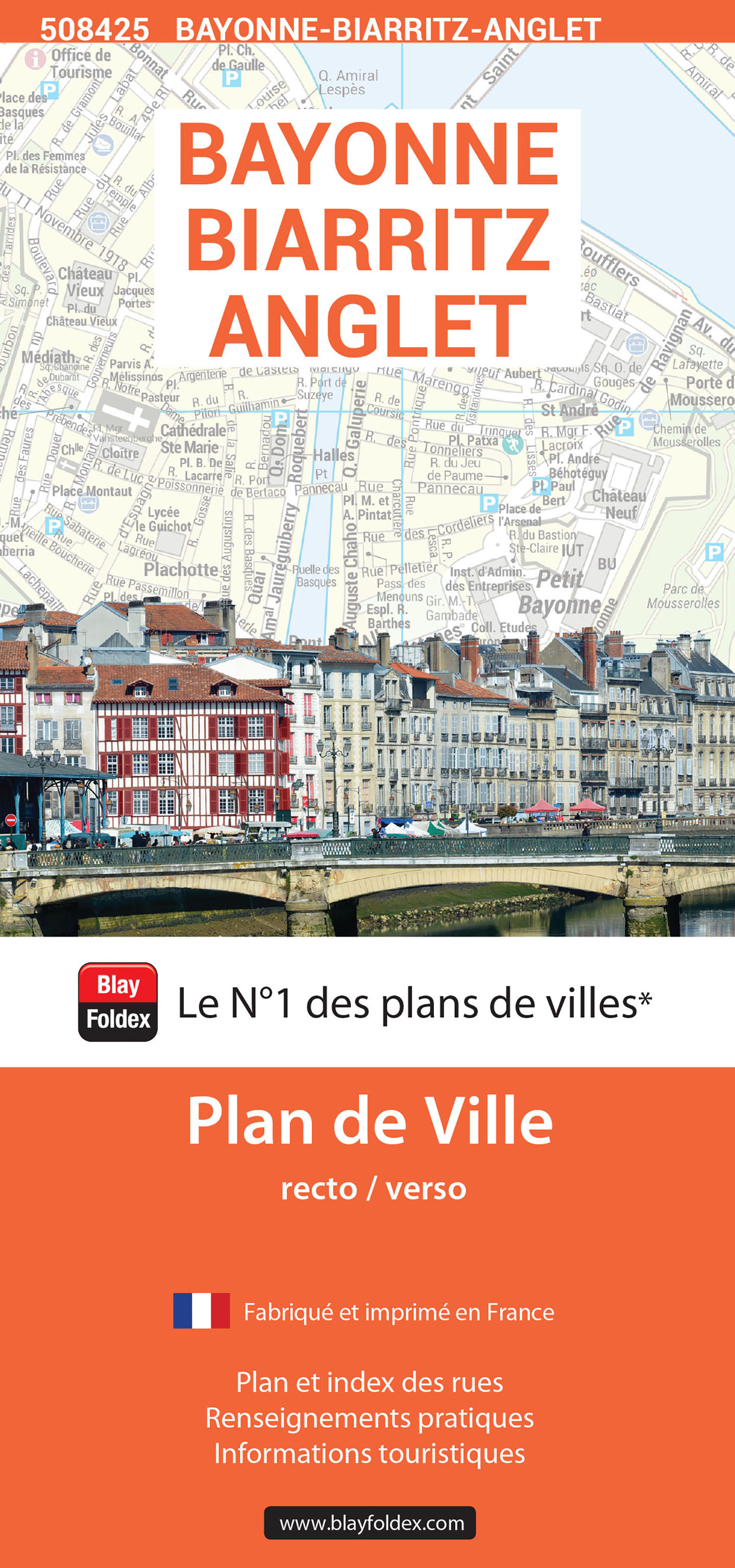Le plan de ville de Bayonne Biarritz et Anglet indique les principaux sites et monuments à visiter : BAYONNE : Cathédrale Sainte-Marie, Eglise Saint-André, Eglise Saint-Esprit, Musée Léon Bonnat, Musée Basque, les Jardins Botaniques, le Château Vieux ou encore la Citadelles. BIARRITZ : L’Eglise Saint-Martin, Le Phare, la Villa Eugénie, le Musée de la Mer, le musée historique de Biarritz. Ce plan de ville contient l’ensemble des rues avec leur nom, les principaux bâtiments publics et touristiques. Un index complet des rues et des bâtiments vous permet de vous repérer très facilement. Il couvre les communes Bayonne, Biarritz et Anglet.