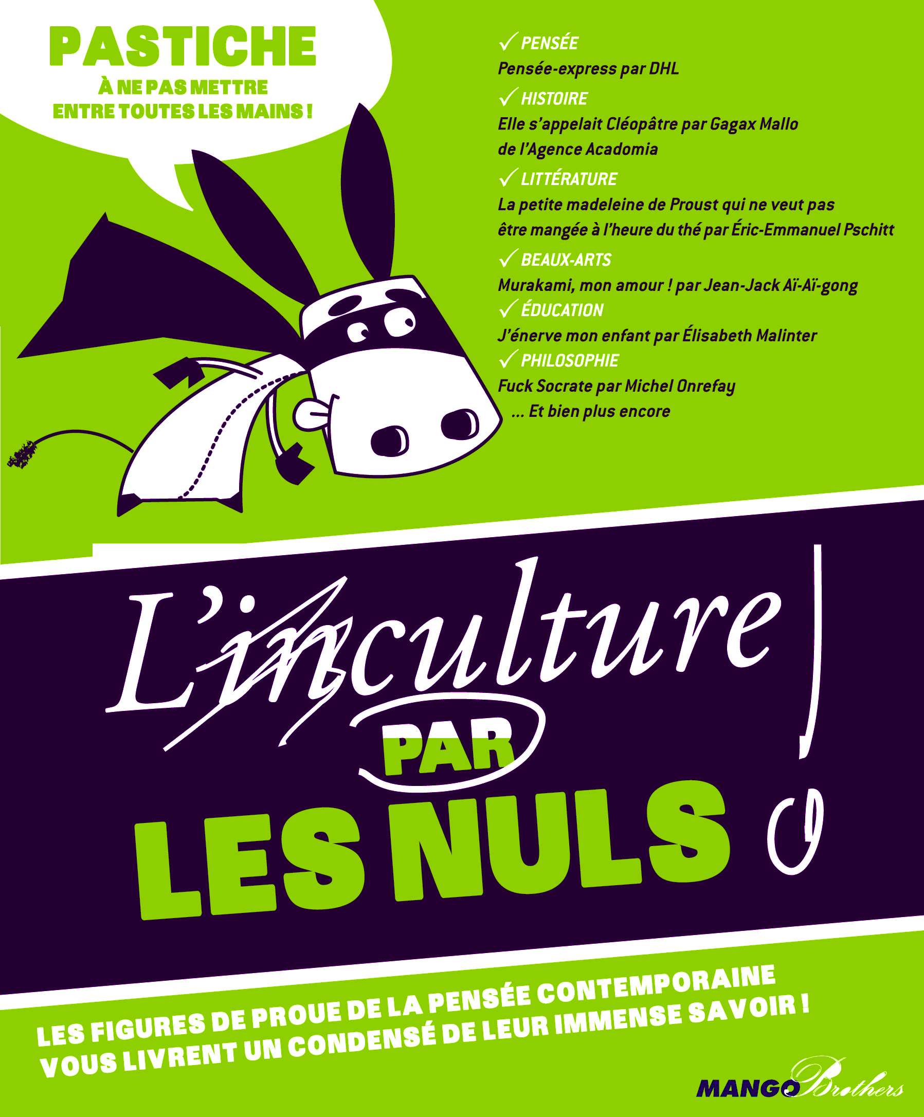 Pastiche à ne pas mettre entre toutes les mains. Chez Pizza Hut, vous hésitez entre la Vivaldi et la Michelangelo, la Caravaggio et le carpaccio ? Vous confondez Martine Aubry et Lamartine, Caliméro et Nocilas Poussin, Van Goth et Jacob Delafon ? Pierre Bergé, Michel Berger et le bâton de Berger ? Vous croyez que José Van Dam est un karatéka, que Michel Foucault présente "Qui veut gagner des millions ?" et que Nicolas Demorand a écrit l' Homme Pressé ? L'histoire, la littérature, la philosophie vous découragent par leur complexité ? Affalez-vous sur votre canapé, enlevez vos chaussures : L'Inculture par les Nuls est pour vous ! Sommaire : -Pensée : pensée-express par DHL -Histoire : Elle s'appelait Cléopâtre par Gagax Mallo de l'Agence Acadomia -Littérature : La petite madeleine de Proust qui ne veut pas être mangée à l'heure du thé par Eric-Emmanuel Pschitt -Beaux-Arts : Murakimi, mon amour ! par Jean-Jack Aï-Aï-gong -Education : J'énerve mon enfant par Elisabeth Malinter -Philosophie : Fuck Socrate par Michel Onrefay ... et bien plus encore !
