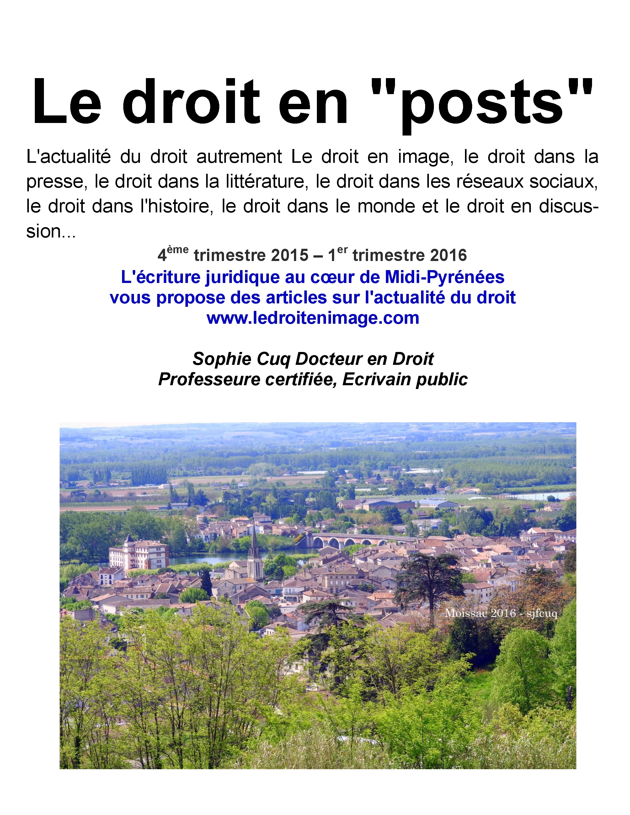 Le droit en "posts" L'actualité du droit autrement Le droit en image, le droit dans la presse, le droit dans la littérature, le droit dans les réseaux sociaux, le droit dans l'histoire, le droit dans le monde et le droit en discussion... 4ème trimestre 2015-1er trimestre 2016 Illustrations par des photographies au coeur de Langue-Pyrénées