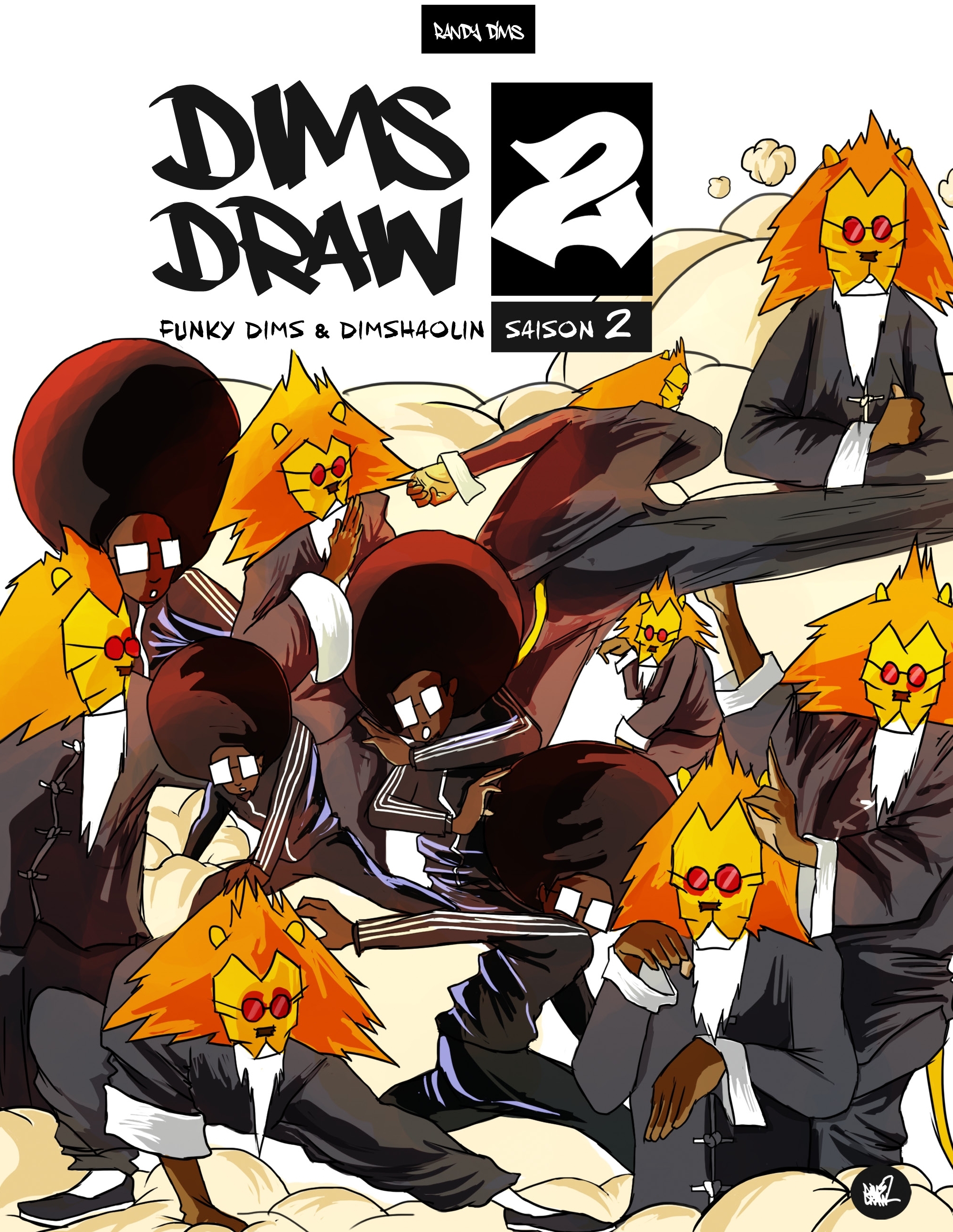 Encore et toujours plus de funk, DimsDraw2 saison 2 ! Venez découvrir les nouvelles aventures de Funky Dims et de son acolyte DimShaolin, la toute première saison de la série issu du blog DimsDraw2. Funky Dims ami et élève de DimShaolin, apprenti b-boy, médecin généraliste à ses heures perdues, il adore la caïpirinha, le KFC et les Pizwichs (Kebab délicieux). DimShaolin "The professor" : alias the Funky Lion, the Master of silence, the big mouth of the jungle, plus connu sous le nom de Dims Shaolin (ou DimShaolin). Il est le sifu (professeur) de Funky Dims, expert du "Gong-fu, Wushu, Chung-kuo, Kuan-tao" (kung fu original). DimShaolin est un lion végétarien qui adore le thé, les fleurs, le miel et les abeilles.