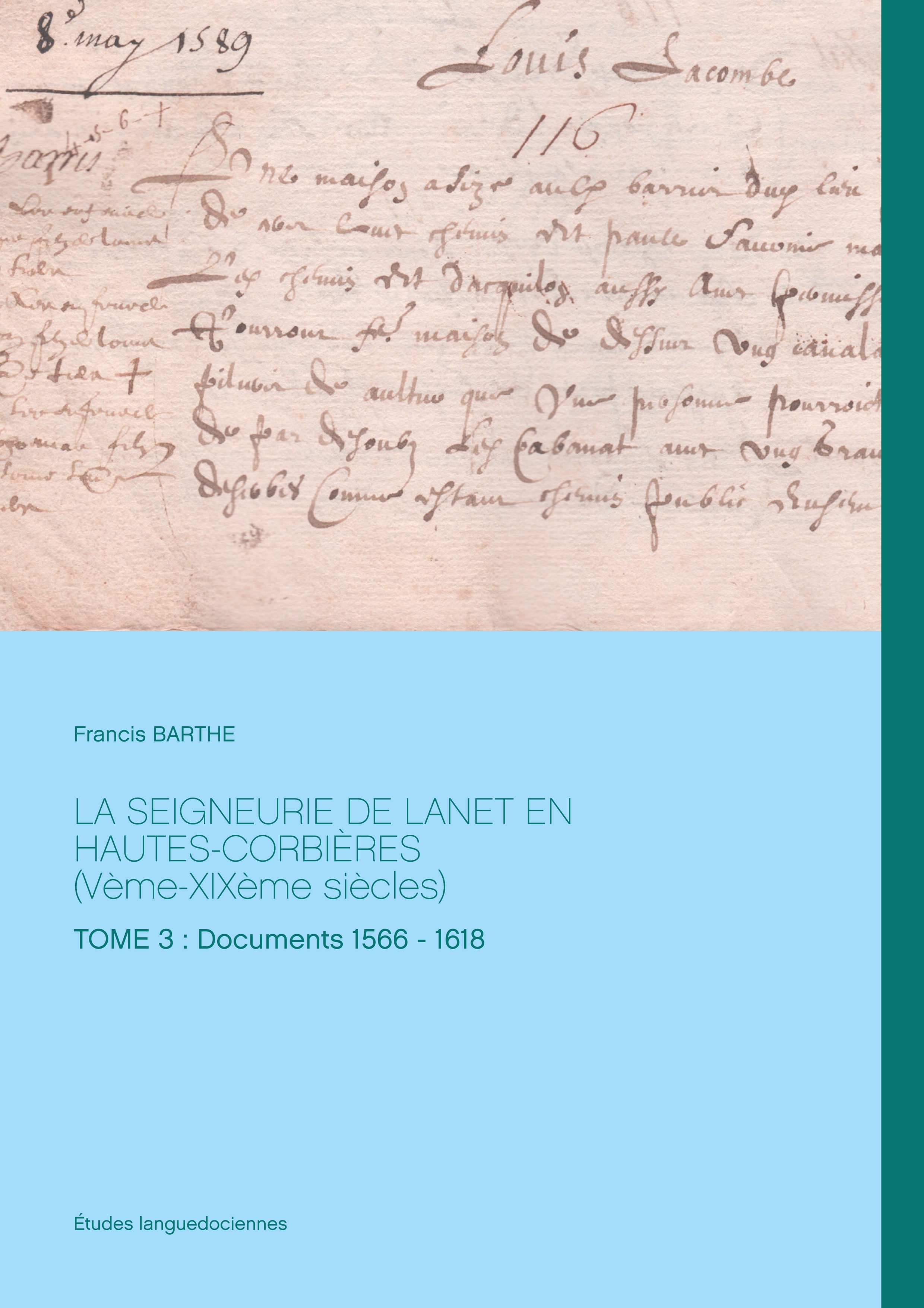 LANET. Petit village des Hautes-Corbières, niché dans un coude de la rivière Orbieu. De grandes familles seigneuriales du Languedoc y élurent domicile par le passé : la famille des Seigneurs de Termes, la famille Darse, la famille de Grave, la famille Dauceresses. Quelques années avant la Révolution, le seigneur de l'époque, fort endetté, choisit de marier une de ses filles à l'héritier d'une famille roturière de Bugarach, Jean Barthe. Ce dernier ne pourra accéder à la noblesse, la Révolution ayant fait son oeuvre. Jean Barthe était mon ancêtre. C'est ainsi que fut transmis dans notre famille, de génération en génération, l'imposant Fonds des Seigneurs de Lanet. Dans le premier tome, nous proposions une approche historique et généalogique à partir de l'ensemble des documents. Le tome 2, déjà paru, entamait la publication intégrale du fonds en présentant les documents 1 à 24, couvrant la période 1215-1564. Ce troisième volume poursuit la publication en présentant les documents 25 à 68, couvrant la période 1566-1618. Dans le présent volume figure entre autre, le Registre des Reconnaissances de 1589 et de nombreux actes notariés au profit du seigneur de Lanet François de Grave. Nous pouvons y voir en filigrane l'expansion foncière entamée à cette époque.