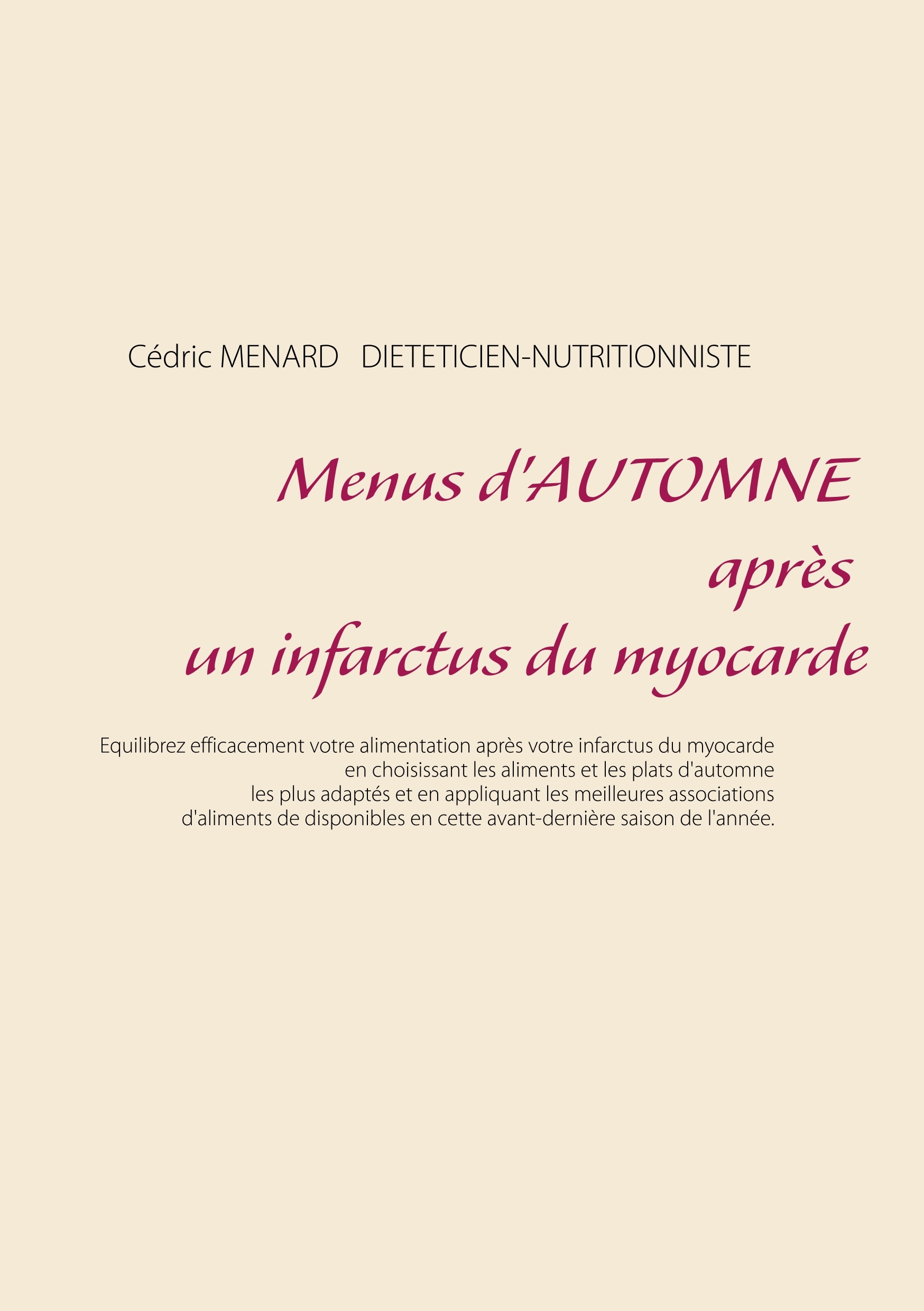 Cet ouvrage est dédié à toutes les personnes ayant souffert d'un infarctus du myocarde, et il offre aux détenteurs des ouvrages du même auteur : « Quelle alimentation après un infarctus du myocarde? » et « Recettes et menus après un infarctus du myocarde » un ouvrage parfaitement complémentaire. L'auteur vous propose trois mois de menus spécifiquement adaptés aux suites nutritionnelles à mettre en oeuvre après un infarctus du myocarde, tous très simples à mettre en pratique grâce à des plats, des légumes et des fruits d'automne vous étant proposés, vous permettant ainsi de mieux adapter votre alimentation à votre cardiopathie. Un ouvrage diététique de référence pour celles et ceux qui souhaitent adapter leur alimentation à leur maladie cardiaque.
