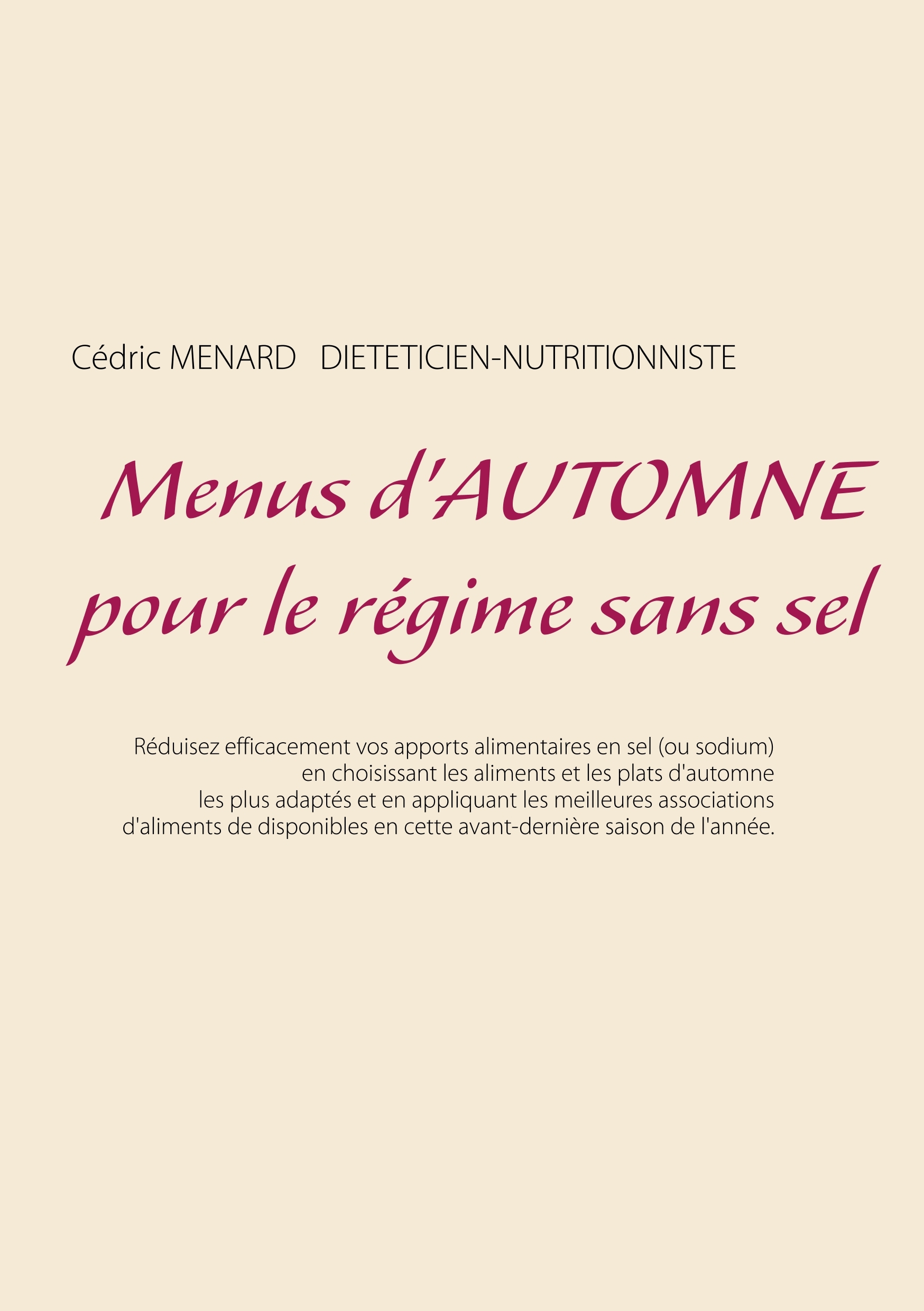 Cet ouvrage est dédié à toutes les personnes soumises au régime alimentaire sans sel ou pauvre en sodium, et il offre aux détenteurs des ouvrages du même auteur : « Le régime sans sel » et « Recettes et menus pauvre en sel » un ouvrage parfaitement complémentaire. L'auteur vous propose trois mois de menus spécifiquement adaptés à votre restriction sodée, tous très simples à mettre en pratique grâce à des plats, des légumes et des fruits d'automne vous étant proposés, vous permettant ainsi de mieux adapter votre alimentation à votre régime alimentaire sans sel. Un ouvrage diététique de référence pour celles et ceux qui doivent réduire leurs apports alimentaires en sel et donc en sodium grâce à leur alimentation !