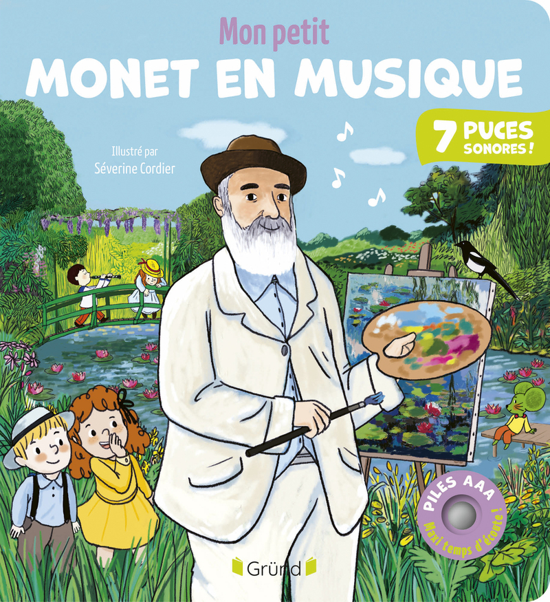 Un voyage musical avec Claude Monet ! Avec ses puces sonores musicales, ce recueil est unique. Sur chaque page, l'enfant recherche dans l'illustration le petit bouton qui déclenchera la musique. C'est une immersion dans l'univers de Claude Monet qui est proposée au fil des tableaux et des puces sonores de ce livre. Chaque œuvre reproduite est en effet accompagnée d'un extrait musical qui évoque l'ambiance transmise par la toile. Ainsi, " Les Arabesques " de Debussy accompagnent l'" Autoportrait coiffé d'un béret ". Pour " La Pie ", la gaieté et la légèreté de la scène sont évoquées par le " Pizzicato " de Léo Delibes. On imagine l'oiseau sautillant dans la neige au son des cordes du violon. " Les Jeux d'eau " de Maurice Ravel accompagnent " Impression soleil levant " comme de petites vagues sur la mer. " L'Arlésienne " de Bizet évoque avec entrain l'agitation de " La Gare Saint-Lazare ". " Le Jardin féérique " de Ravel transcrit avec délicatesse la beauté des célèbres " Nymphéas " du jardin du peintre. " L'Idylle " de Chabrier évoque la lumière du tableau " Les coquelicots " et " Dolly Suite " de Fauré accompagne les mouvements de " Femmes au Jardin ". Les illustrations de Séverine Cordier, adaptées aux petits accompagnent ce voyage musical et visuel.