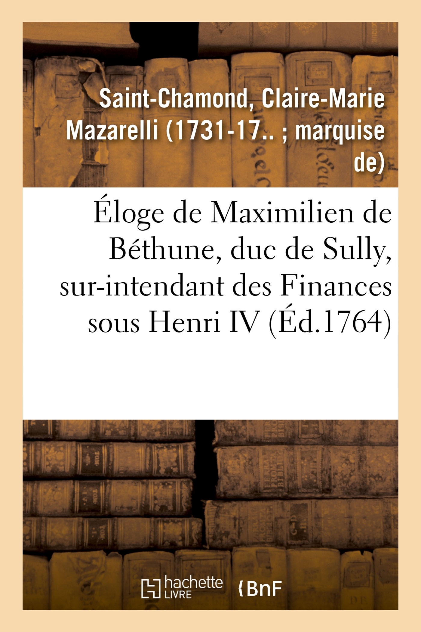 Éloge de Maximilien de Béthune, duc de Sully , sur-intendant des Finances sous Henri IV. Par Mlle Mazarelli Date de l'édition originale : 1764 Le présent ouvrage s'inscrit dans une politique de conservation patrimoniale des ouvrages de la littérature Française mise en place avec la BNF. HACHETTE LIVRE et la BNF proposent ainsi un catalogue de titres indisponibles, la BNF ayant numérisé ces oeuvres et HACHETTE LIVRE les imprimant à la demande. Certains de ces ouvrages reflètent des courants de pensée caractéristiques de leur époque, mais qui seraient aujourd'hui jugés condamnables. Ils n'en appartiennent pas moins à l'histoire des idées en France et sont susceptibles de présenter un intérêt scientifique ou historique. Le sens de notre démarche éditoriale consiste ainsi à permettre l'accès à ces oeuvres sans pour autant que nous en cautionnions en aucune façon le contenu. Pour plus d'informations, rendez-vous sur www.hachettebnf.fr