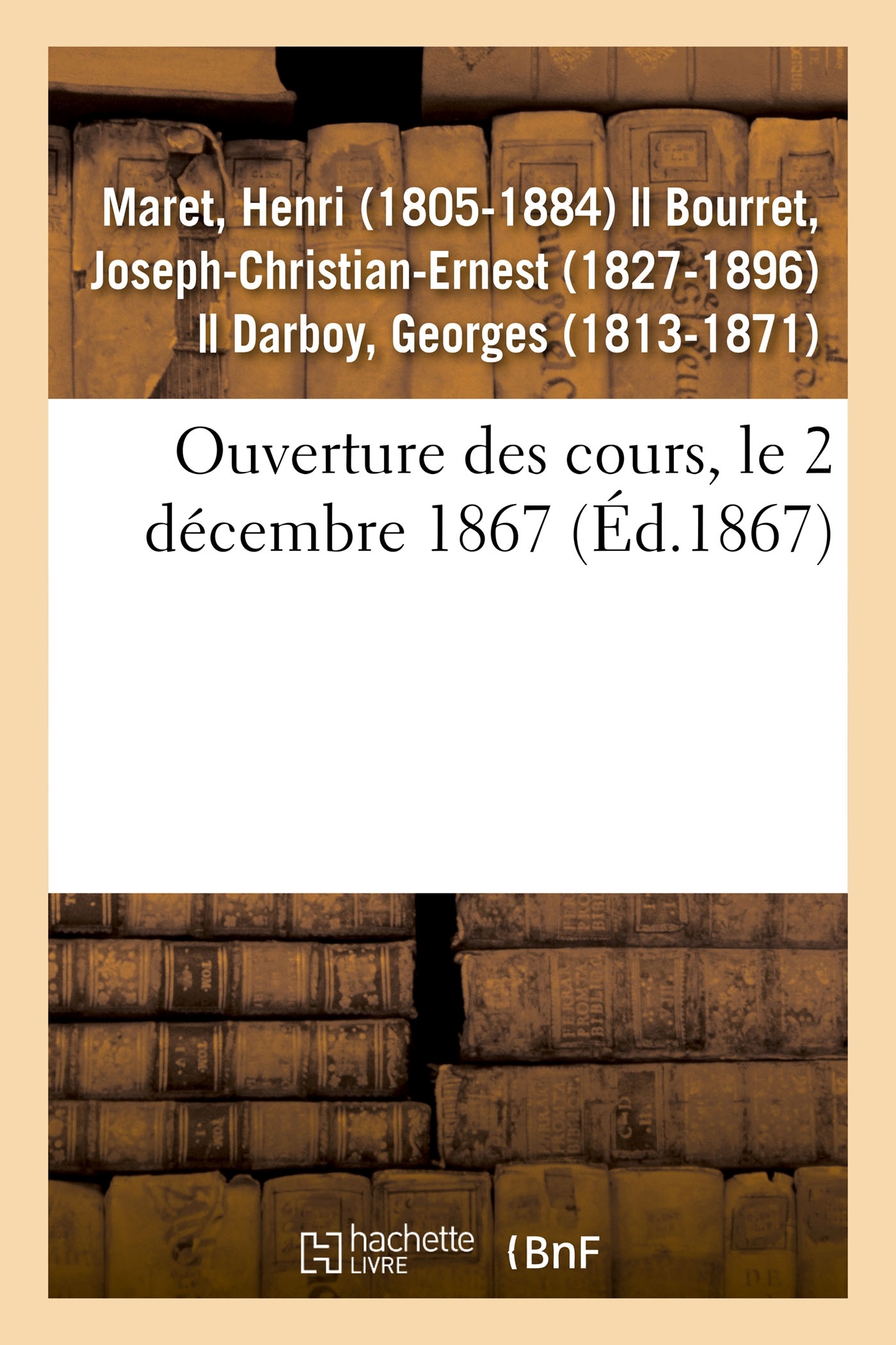 Ouverture des cours, le 2 décembre 1867 / rapport de Mgr l'évêque de Sura [Maret], doyen... Date de l'édition originale : 1867 Le présent ouvrage s'inscrit dans une politique de conservation patrimoniale des ouvrages de la littérature Française mise en place avec la BNF. HACHETTE LIVRE et la BNF proposent ainsi un catalogue de titres indisponibles, la BNF ayant numérisé ces oeuvres et HACHETTE LIVRE les imprimant à la demande. Certains de ces ouvrages reflètent des courants de pensée caractéristiques de leur époque, mais qui seraient aujourd'hui jugés condamnables. Ils n'en appartiennent pas moins à l'histoire des idées en France et sont susceptibles de présenter un intérêt scientifique ou historique. Le sens de notre démarche éditoriale consiste ainsi à permettre l'accès à ces oeuvres sans pour autant que nous en cautionnions en aucune façon le contenu. Pour plus d'informations, rendez-vous sur www.hachettebnf.fr