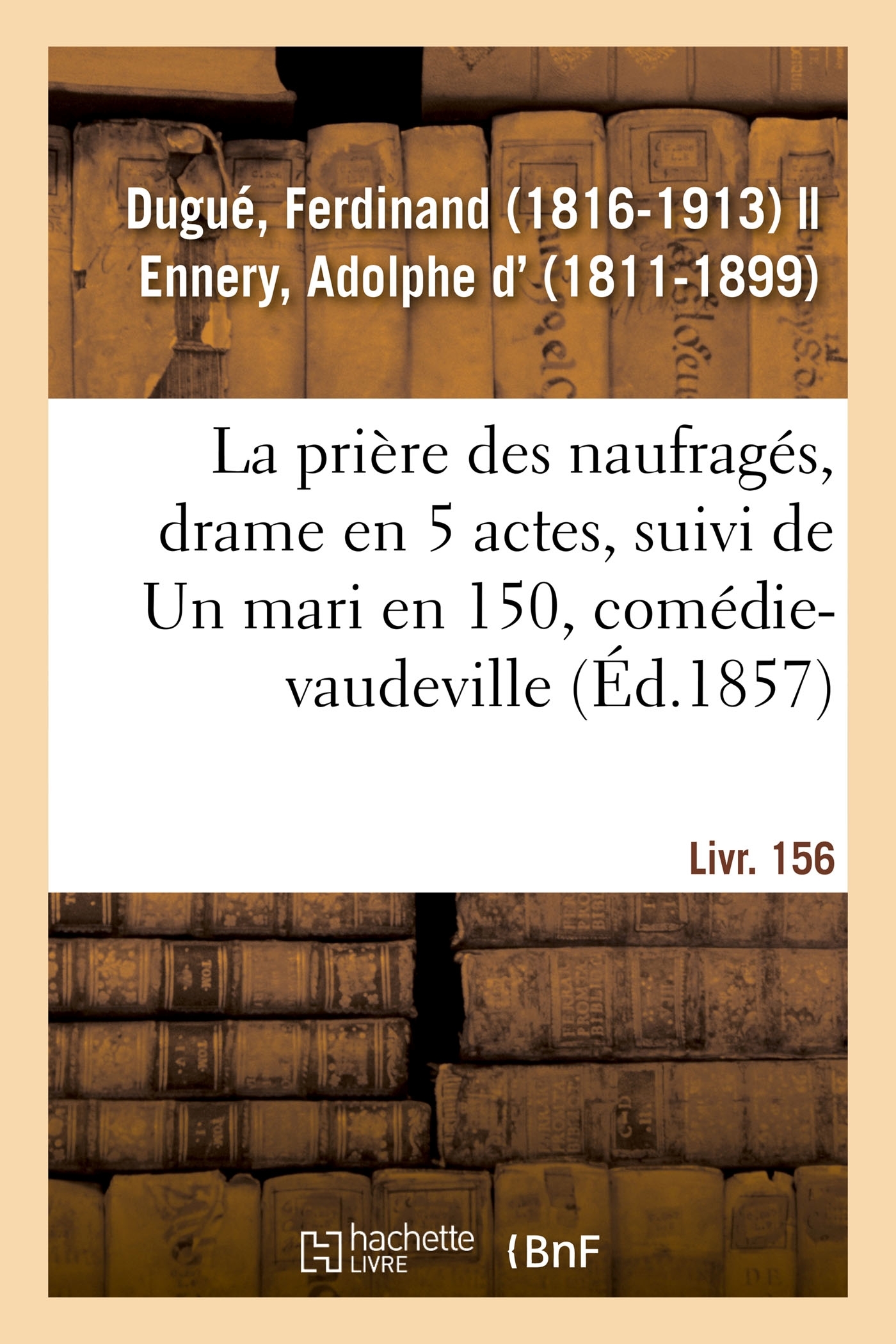 La prière des naufragés : drame en 5 actes. [suivi de] Un mari en 150 : comédie-vaudeville en 1 acte. Livr. 156 / par MM. d'Ennery et Ferdinand Dugué ; par M. Émile de Najac Date de l'édition originale : 1857 Le présent ouvrage s'inscrit dans une politique de conservation patrimoniale des ouvrages de la littérature Française mise en place avec la BNF. HACHETTE LIVRE et la BNF proposent ainsi un catalogue de titres indisponibles, la BNF ayant numérisé ces oeuvres et HACHETTE LIVRE les imprimant à la demande. Certains de ces ouvrages reflètent des courants de pensée caractéristiques de leur époque, mais qui seraient aujourd'hui jugés condamnables. Ils n'en appartiennent pas moins à l'histoire des idées en France et sont susceptibles de présenter un intérêt scientifique ou historique. Le sens de notre démarche éditoriale consiste ainsi à permettre l'accès à ces oeuvres sans pour autant que nous en cautionnions en aucune façon le contenu. Pour plus d'informations, rendez-vous sur www.hachettebnf.fr