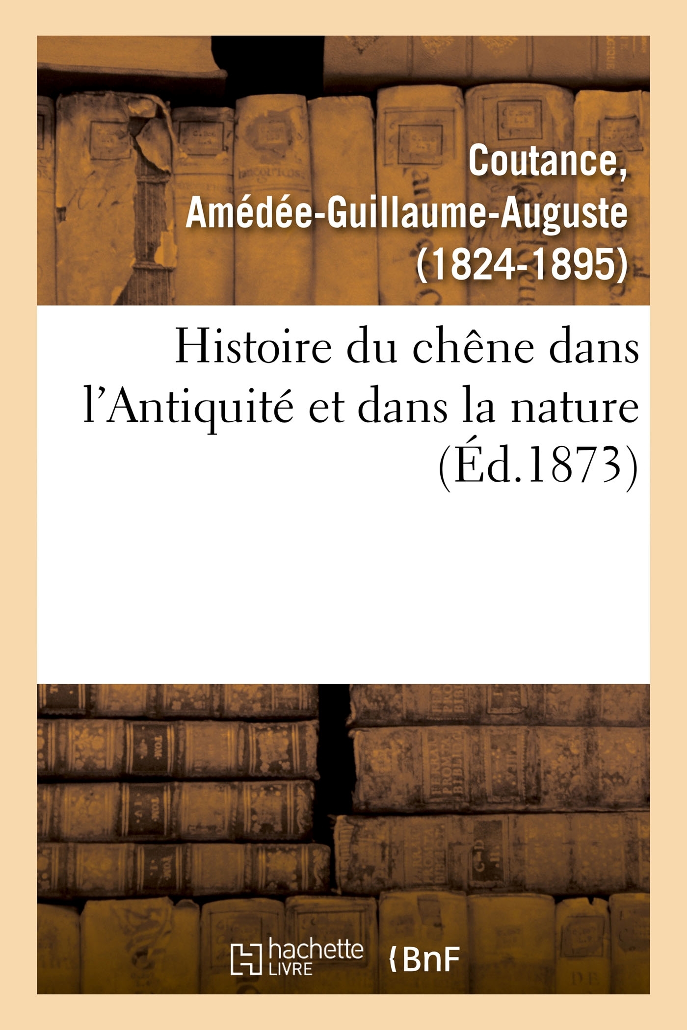 Histoire du chêne dans l'Antiquité & dans la nature : ses applications à l'industrie, aux constructions navales, aux sciences et aux arts / par A. Coutance,.. Date de l'édition originale : 1873 Le présent ouvrage s'inscrit dans une politique de conservation patrimoniale des ouvrages de la littérature Française mise en place avec la BNF. HACHETTE LIVRE et la BNF proposent ainsi un catalogue de titres indisponibles, la BNF ayant numérisé ces oeuvres et HACHETTE LIVRE les imprimant à la demande. Certains de ces ouvrages reflètent des courants de pensée caractéristiques de leur époque, mais qui seraient aujourd'hui jugés condamnables. Ils n'en appartiennent pas moins à l'histoire des idées en France et sont susceptibles de présenter un intérêt scientifique ou historique. Le sens de notre démarche éditoriale consiste ainsi à permettre l'accès à ces oeuvres sans pour autant que nous en cautionnions en aucune façon le contenu. Pour plus d'informations, rendez-vous sur www.hachettebnf.fr