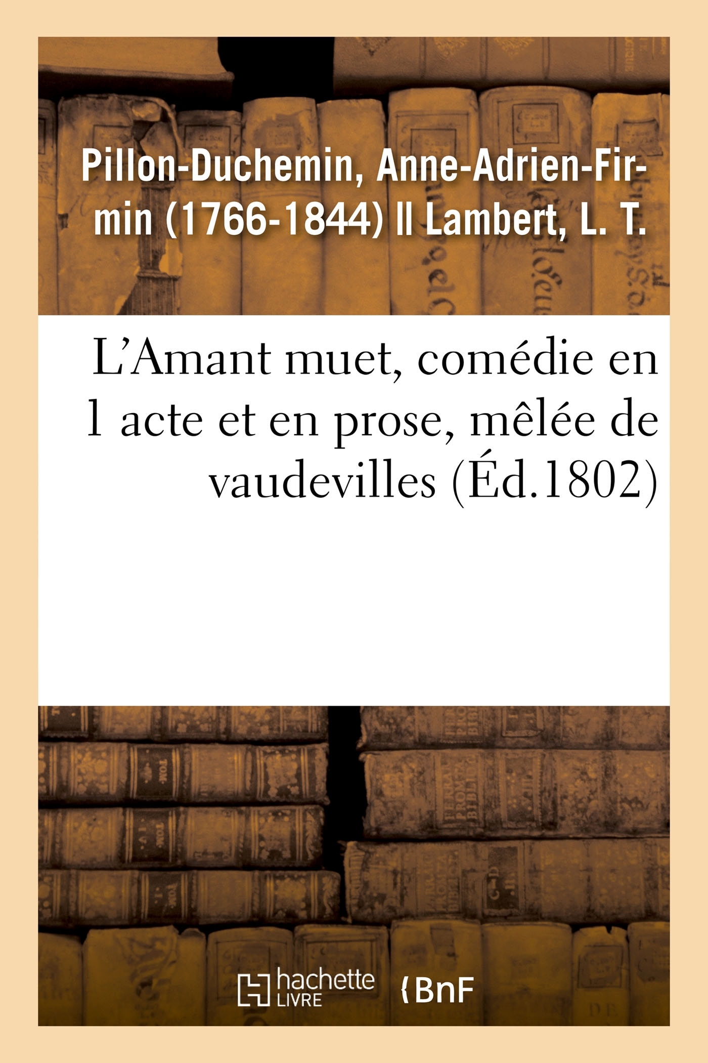 L'Amant muet, comédie en 1 acte et en prose, mêlée de vaudevilles, par les citoyens Pillon et Lambert... [Paris, Théâtre des Jeunes-Élèves, 27 floréal an 8.] Date de l'édition originale : 1802 Le présent ouvrage s'inscrit dans une politique de conservation patrimoniale des ouvrages de la littérature Française mise en place avec la BNF. HACHETTE LIVRE et la BNF proposent ainsi un catalogue de titres indisponibles, la BNF ayant numérisé ces oeuvres et HACHETTE LIVRE les imprimant à la demande. Certains de ces ouvrages reflètent des courants de pensée caractéristiques de leur époque, mais qui seraient aujourd'hui jugés condamnables. Ils n'en appartiennent pas moins à l'histoire des idées en France et sont susceptibles de présenter un intérêt scientifique ou historique. Le sens de notre démarche éditoriale consiste ainsi à permettre l'accès à ces oeuvres sans pour autant que nous en cautionnions en aucune façon le contenu. Pour plus d'informations, rendez-vous sur www.hachettebnf.fr