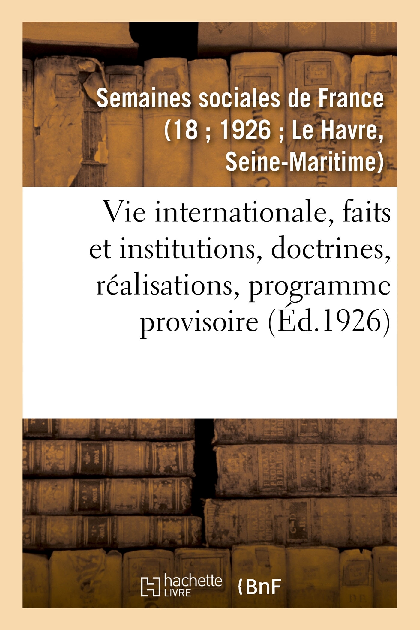 Semaines sociales de France, 18e session, Le Havre, du 2 au 8 août 1926 : sujet de la semaine la vie internationale, faits et institutions, doctrines, réalisations, programme provisoire Date de l'édition originale : 1926 Le présent ouvrage s'inscrit dans une politique de conservation patrimoniale des ouvrages de la littérature Française mise en place avec la BNF. HACHETTE LIVRE et la BNF proposent ainsi un catalogue de titres indisponibles, la BNF ayant numérisé ces oeuvres et HACHETTE LIVRE les imprimant à la demande. Certains de ces ouvrages reflètent des courants de pensée caractéristiques de leur époque, mais qui seraient aujourd'hui jugés condamnables. Ils n'en appartiennent pas moins à l'histoire des idées en France et sont susceptibles de présenter un intérêt scientifique ou historique. Le sens de notre démarche éditoriale consiste ainsi à permettre l'accès à ces oeuvres sans pour autant que nous en cautionnions en aucune façon le contenu. Pour plus d'informations, rendez-vous sur www.hachettebnf.fr