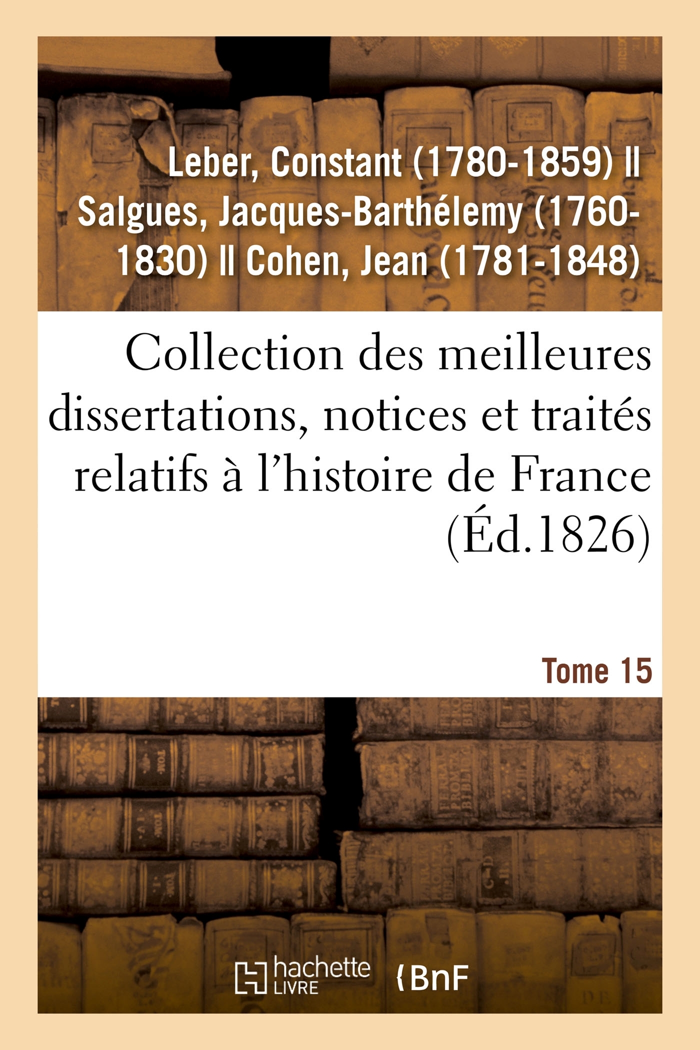 Collection des meilleures dissertations, notices et traités particuliers relatifs à l'histoire de France : composée en grande partie de pièces rares ou qui n'ont jamais été publiées séparément, pour servir à compléter toutes les collections de mémoires sur cette matière. Tome 15 / par MM. C. Leber, J.-B. Salgues et J. Cohen Date de l'édition originale : 1826-1838 Le présent ouvrage s'inscrit dans une politique de conservation patrimoniale des ouvrages de la littérature Française mise en place avec la BNF. HACHETTE LIVRE et la BNF proposent ainsi un catalogue de titres indisponibles, la BNF ayant numérisé ces oeuvres et HACHETTE LIVRE les imprimant à la demande. Certains de ces ouvrages reflètent des courants de pensée caractéristiques de leur époque, mais qui seraient aujourd'hui jugés condamnables. Ils n'en appartiennent pas moins à l'histoire des idées en France et sont susceptibles de présenter un intérêt scientifique ou historique. Le sens de notre démarche éditoriale consiste ainsi à permettre l'accès à ces oeuvres sans pour autant que nous en cautionnions en aucune façon le contenu. Pour plus d'informations, rendez-vous sur www.hachettebnf.fr