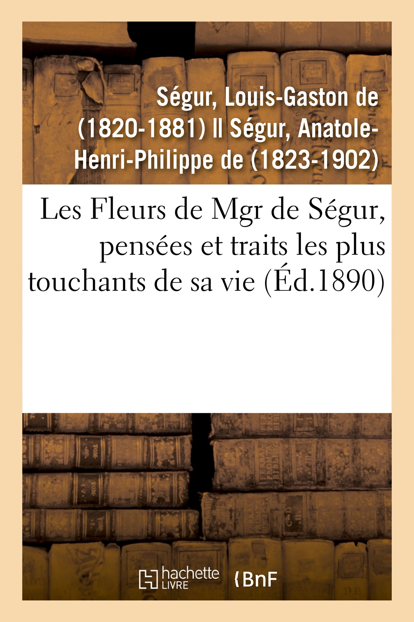 Les Fleurs de Mgr de Ségur, pensées et traits les plus touchants de sa vie , par le Mis de Ségur Date de l'édition originale : 1890 Le présent ouvrage s'inscrit dans une politique de conservation patrimoniale des ouvrages de la littérature Française mise en place avec la BNF. HACHETTE LIVRE et la BNF proposent ainsi un catalogue de titres indisponibles, la BNF ayant numérisé ces oeuvres et HACHETTE LIVRE les imprimant à la demande. Certains de ces ouvrages reflètent des courants de pensée caractéristiques de leur époque, mais qui seraient aujourd'hui jugés condamnables. Ils n'en appartiennent pas moins à l'histoire des idées en France et sont susceptibles de présenter un intérêt scientifique ou historique. Le sens de notre démarche éditoriale consiste ainsi à permettre l'accès à ces oeuvres sans pour autant que nous en cautionnions en aucune façon le contenu. Pour plus d'informations, rendez-vous sur www.hachettebnf.fr