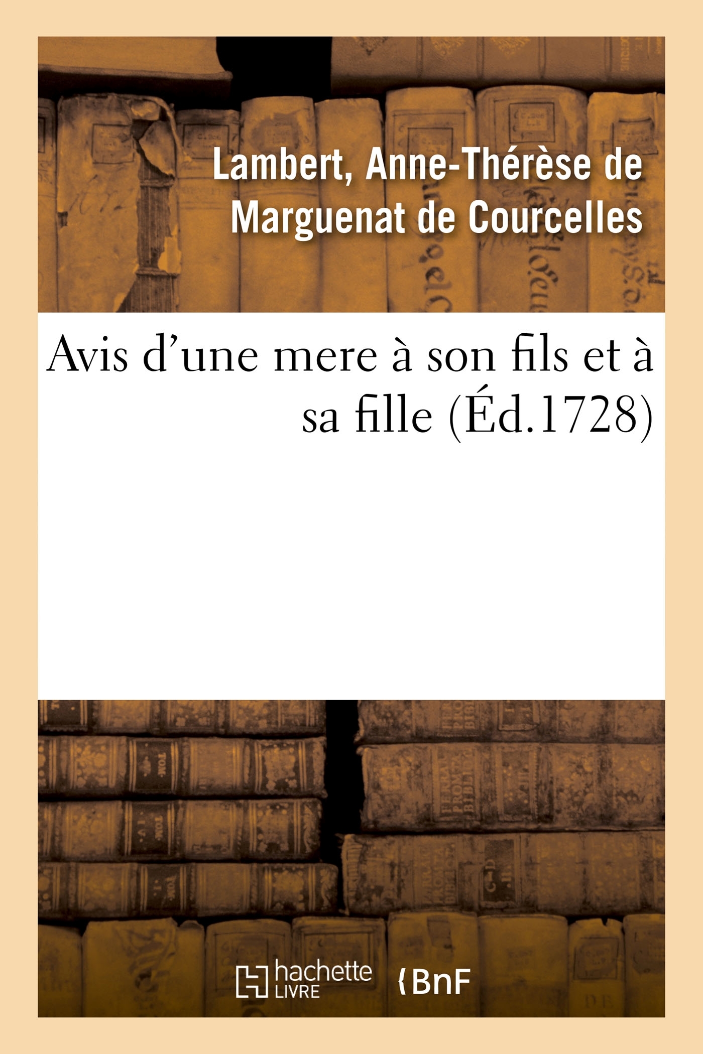 Avis d'une mere à son fils et à sa fille Date de l'édition originale : 1728 Le présent ouvrage s'inscrit dans une politique de conservation patrimoniale des ouvrages de la littérature Française mise en place avec la BNF. HACHETTE LIVRE et la BNF proposent ainsi un catalogue de titres indisponibles, la BNF ayant numérisé ces oeuvres et HACHETTE LIVRE les imprimant à la demande. Certains de ces ouvrages reflètent des courants de pensée caractéristiques de leur époque, mais qui seraient aujourd'hui jugés condamnables. Ils n'en appartiennent pas moins à l'histoire des idées en France et sont susceptibles de présenter un intérêt scientifique ou historique. Le sens de notre démarche éditoriale consiste ainsi à permettre l'accès à ces oeuvres sans pour autant que nous en cautionnions en aucune façon le contenu. Pour plus d'informations, rendez-vous sur www.hachettebnf.fr
