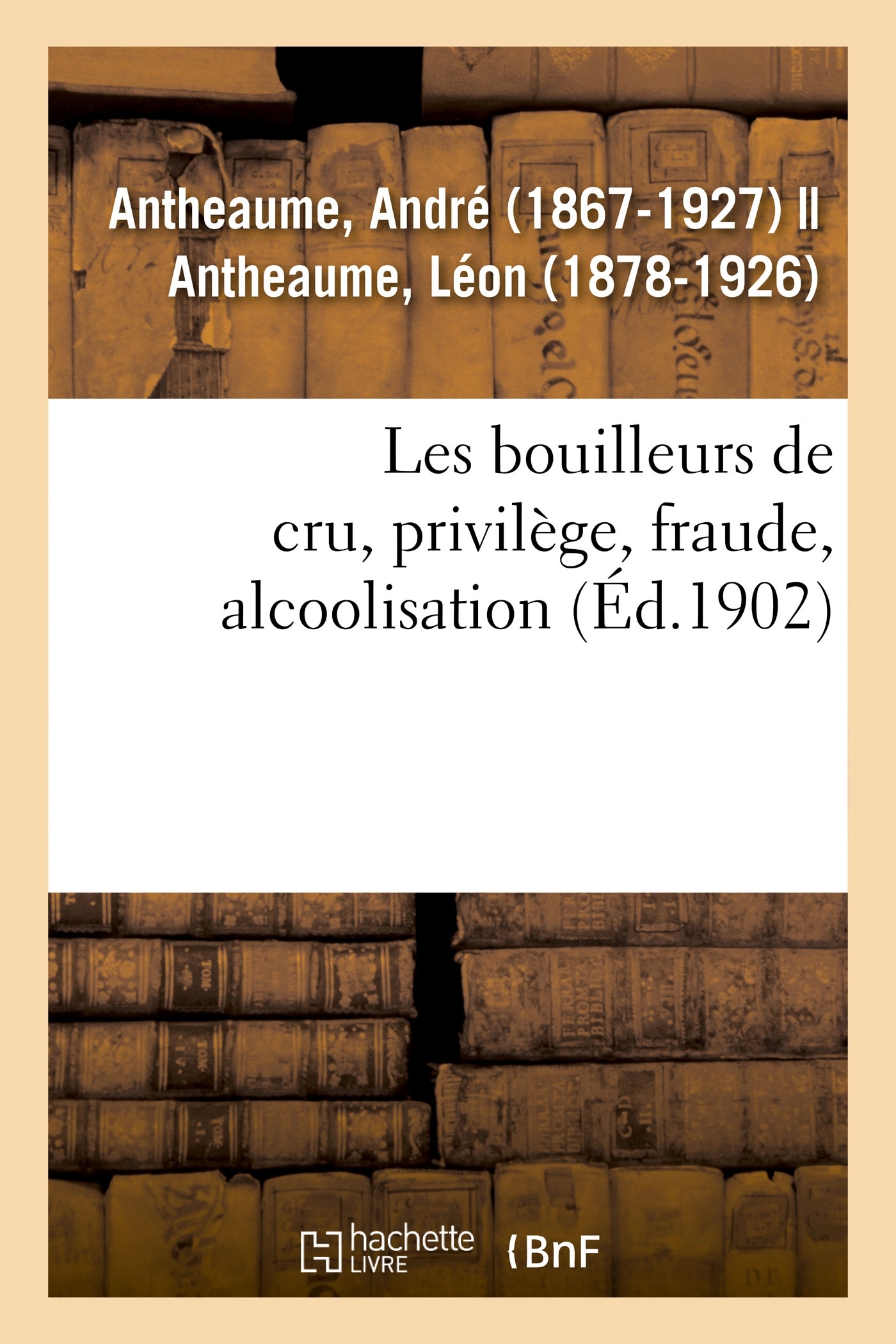 Les bouilleurs de cru : privilège, fraude, alcoolisation / par André Antheaume,... et Léon Antheaume,... http://gallica.bnf.fr/ark:/12148/bpt6k1412237r. Le présent ouvrage s'inscrit dans une politique de conservation patrimoniale des ouvrages de la littérature Française mise en place avec la BNF. HACHETTE LIVRE et la BNF proposent ainsi un catalogue de titres indisponibles, la BNF ayant numérisé ces oeuvres et HACHETTE LIVRE les imprimant à la demande. Certains de ces ouvrages reflètent des courants de pensée caractéristiques de leur époque, mais qui seraient aujourd'hui jugés condamnables. Ils n'en appartiennent pas moins à l'histoire des idées en France et sont susceptibles de présenter un intérêt scientifique ou historique. Le sens de notre démarche éditoriale consiste ainsi à permettre l'accès à ces oeuvres sans pour autant que nous en cautionnions en aucune façon le contenu. Pour plus d'informations, rendez-vous sur le site hachettebnf.fr.