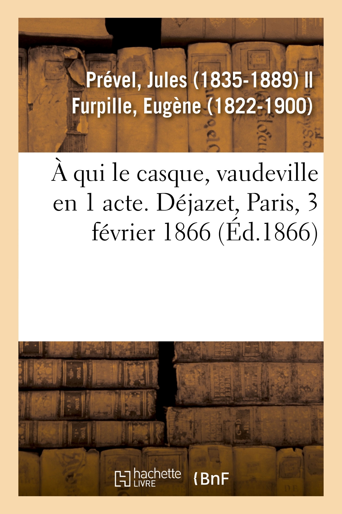 À qui le casque ? vaudeville en 1 acte, par Eugène Furpille et Jules Prével... [Paris, Déjazet, 3 février 1866.] http://gallica.bnf.fr/ark:/12148/bpt6k5741944c. Le présent ouvrage s'inscrit dans une politique de conservation patrimoniale des ouvrages de la littérature Française mise en place avec la BNF. HACHETTE LIVRE et la BNF proposent ainsi un catalogue de titres indisponibles, la BNF ayant numérisé ces oeuvres et HACHETTE LIVRE les imprimant à la demande. Certains de ces ouvrages reflètent des courants de pensée caractéristiques de leur époque, mais qui seraient aujourd'hui jugés condamnables. Ils n'en appartiennent pas moins à l'histoire des idées en France et sont susceptibles de présenter un intérêt scientifique ou historique. Le sens de notre démarche éditoriale consiste ainsi à permettre l'accès à ces oeuvres sans pour autant que nous en cautionnions en aucune façon le contenu. Pour plus d'informations, rendez-vous sur le site hachettebnf.fr.