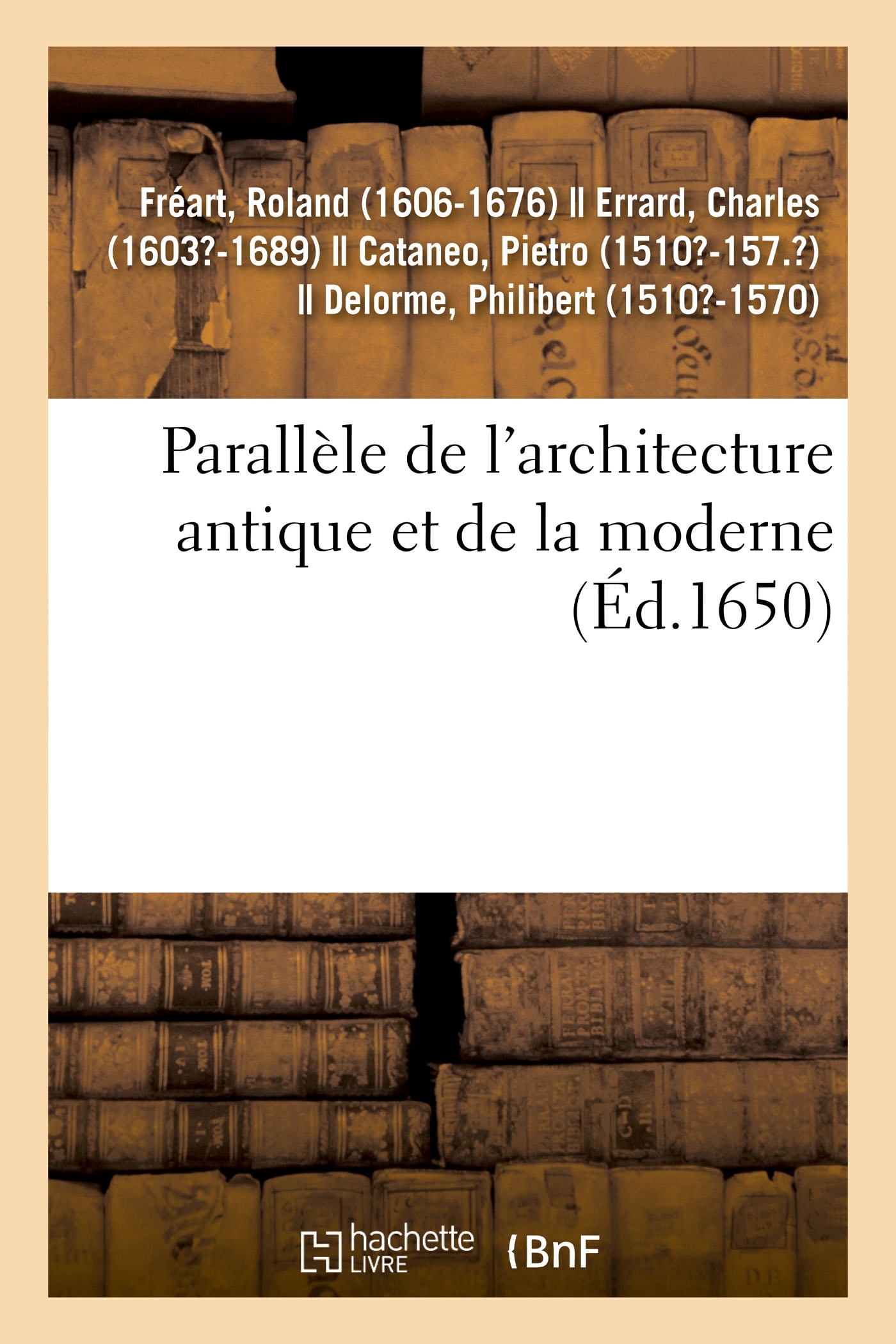 Parallèle de l'architecture antique et de la moderne , avec un recueil des dix principaux autheurs qui ont écrit des cinq ordres, sçavoir : Palladio et Scamozzi, Serlio et Vignola, D. Barbaro et Cataneo, L. B. Alberti et Viola, Bullant et de Lorme, comparez entre eux... [Par R. Fréart, sieur de Chambray et Charles Errard] http://gallica.bnf.fr/ark:/12148/bpt6k6553174c. Le présent ouvrage s'inscrit dans une politique de conservation patrimoniale des ouvrages de la littérature Française mise en place avec la BNF. HACHETTE LIVRE et la BNF proposent ainsi un catalogue de titres indisponibles, la BNF ayant numérisé ces oeuvres et HACHETTE LIVRE les imprimant à la demande. Certains de ces ouvrages reflètent des courants de pensée caractéristiques de leur époque, mais qui seraient aujourd'hui jugés condamnables. Ils n'en appartiennent pas moins à l'histoire des idées en France et sont susceptibles de présenter un intérêt scientifique ou historique. Le sens de notre démarche éditoriale consiste ainsi à permettre l'accès à ces oeuvres sans pour autant que nous en cautionnions en aucune façon le contenu. Pour plus d'informations, rendez-vous sur le site hachettebnf.fr.