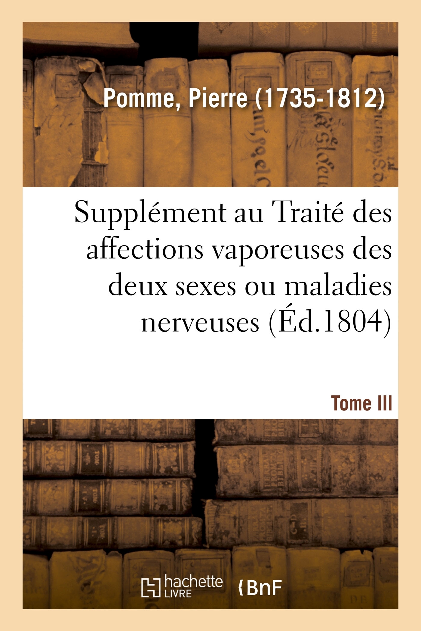 Supplément au Traité des affections vaporeuses des deux sexes, ou maladies nerveuses, dans lequel on trouve : 1° Une nouvelle édition considérablement augmentée du Mémoire et des observations cliniques sur l'abus du quinquina ; 2° la réfutation de la doctine médicale de Brown ; 3° une notice sur l'électricité, le galvanisme et le magnétisme, par Pierre Pomme,... Tome III http://gallica.bnf.fr/ark:/12148/bpt6k5714954v. Le présent ouvrage s'inscrit dans une politique de conservation patrimoniale des ouvrages de la littérature Française mise en place avec la BNF. HACHETTE LIVRE et la BNF proposent ainsi un catalogue de titres indisponibles, la BNF ayant numérisé ces oeuvres et HACHETTE LIVRE les imprimant à la demande. Certains de ces ouvrages reflètent des courants de pensée caractéristiques de leur époque, mais qui seraient aujourd'hui jugés condamnables. Ils n'en appartiennent pas moins à l'histoire des idées en France et sont susceptibles de présenter un intérêt scientifique ou historique. Le sens de notre démarche éditoriale consiste ainsi à permettre l'accès à ces oeuvres sans pour autant que nous en cautionnions en aucune façon le contenu. Pour plus d'informations, rendez-vous sur le site hachettebnf.fr.