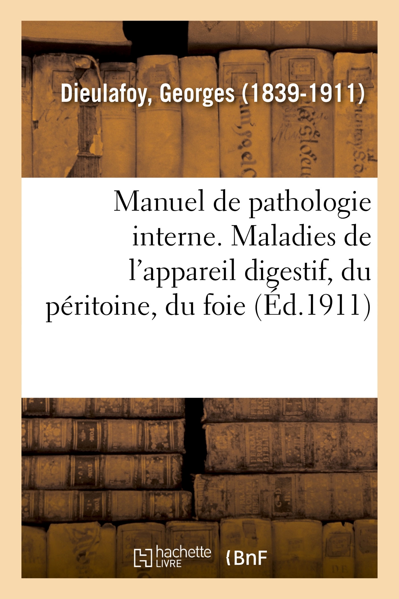 Manuel de pathologie interne. Maladies de l'appareil digestif, du péritoine, du foie et du pancréas / par le professeur Georges Dieulafoy http://gallica.bnf.fr/ark:/12148/bpt6k5823734m. Le présent ouvrage s'inscrit dans une politique de conservation patrimoniale des ouvrages de la littérature Française mise en place avec la BNF. HACHETTE LIVRE et la BNF proposent ainsi un catalogue de titres indisponibles, la BNF ayant numérisé ces oeuvres et HACHETTE LIVRE les imprimant à la demande. Certains de ces ouvrages reflètent des courants de pensée caractéristiques de leur époque, mais qui seraient aujourd'hui jugés condamnables. Ils n'en appartiennent pas moins à l'histoire des idées en France et sont susceptibles de présenter un intérêt scientifique ou historique. Le sens de notre démarche éditoriale consiste ainsi à permettre l'accès à ces oeuvres sans pour autant que nous en cautionnions en aucune façon le contenu. Pour plus d'informations, rendez-vous sur le site hachettebnf.fr.