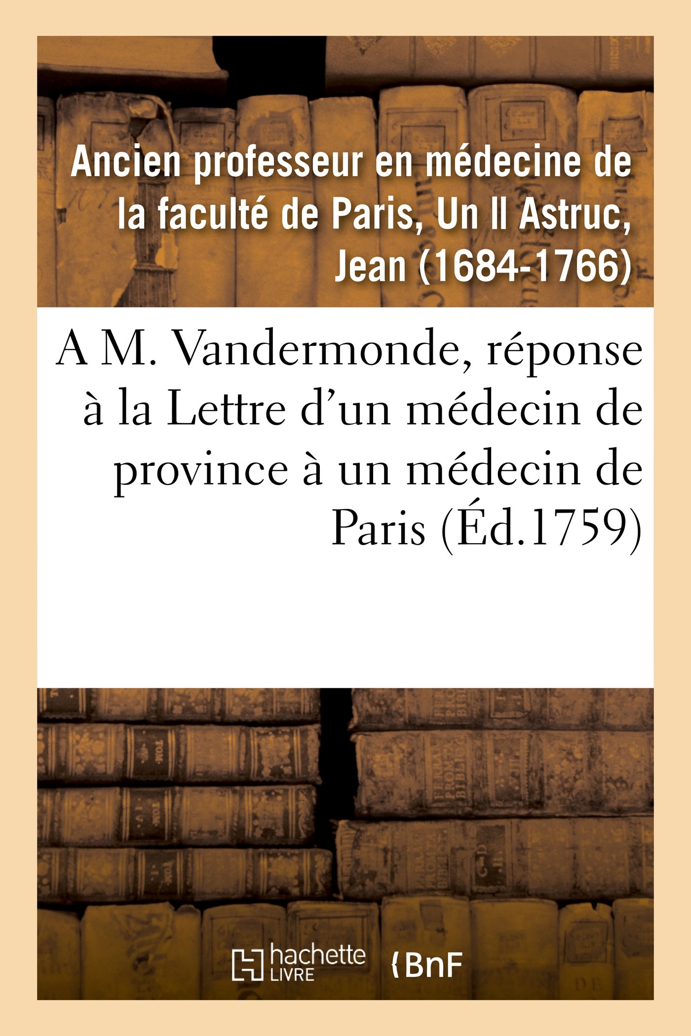Lettre d'un ancien professeur en medecine de la faculté de Paris, a M. Vandermonde, auteur du Journal de medecine, censeur royal, &c. Pour servir de réponse à la Lettre d'un médecin de province à un médecin de Paris . Cette lettre fait la troisiéme piéce d'un ecrit intitulé Recueil de plusieurs piéces concernant le Traité des tumeurs & ulceres, &c. http://gallica.bnf.fr/ark:/12148/bpt6k5461332x. Le présent ouvrage s'inscrit dans une politique de conservation patrimoniale des ouvrages de la littérature Française mise en place avec la BNF. HACHETTE LIVRE et la BNF proposent ainsi un catalogue de titres indisponibles, la BNF ayant numérisé ces oeuvres et HACHETTE LIVRE les imprimant à la demande. Certains de ces ouvrages reflètent des courants de pensée caractéristiques de leur époque, mais qui seraient aujourd'hui jugés condamnables. Ils n'en appartiennent pas moins à l'histoire des idées en France et sont susceptibles de présenter un intérêt scientifique ou historique. Le sens de notre démarche éditoriale consiste ainsi à permettre l'accès à ces oeuvres sans pour autant que nous en cautionnions en aucune façon le contenu. Pour plus d'informations, rendez-vous sur le site hachettebnf.fr.