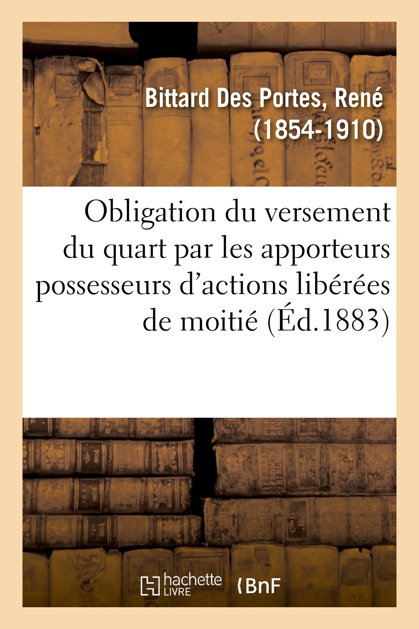 Le Droit et les sociétés. De l'obligation du versement du quart par les apporteurs possesseurs d'actions libérées de moitié, par René Bittard Des Portes,... Date de l'édition originale : 1883 Le présent ouvrage s'inscrit dans une politique de conservation patrimoniale des ouvrages de la littérature Française mise en place avec la BNF. HACHETTE LIVRE et la BNF proposent ainsi un catalogue de titres indisponibles, la BNF ayant numérisé ces oeuvres et HACHETTE LIVRE les imprimant à la demande. Certains de ces ouvrages reflètent des courants de pensée caractéristiques de leur époque, mais qui seraient aujourd'hui jugés condamnables. Ils n'en appartiennent pas moins à l'histoire des idées en France et sont susceptibles de présenter un intérêt scientifique ou historique. Le sens de notre démarche éditoriale consiste ainsi à permettre l'accès à ces oeuvres sans pour autant que nous en cautionnions en aucune façon le contenu. Pour plus d'informations, rendez-vous sur www.hachettebnf.fr