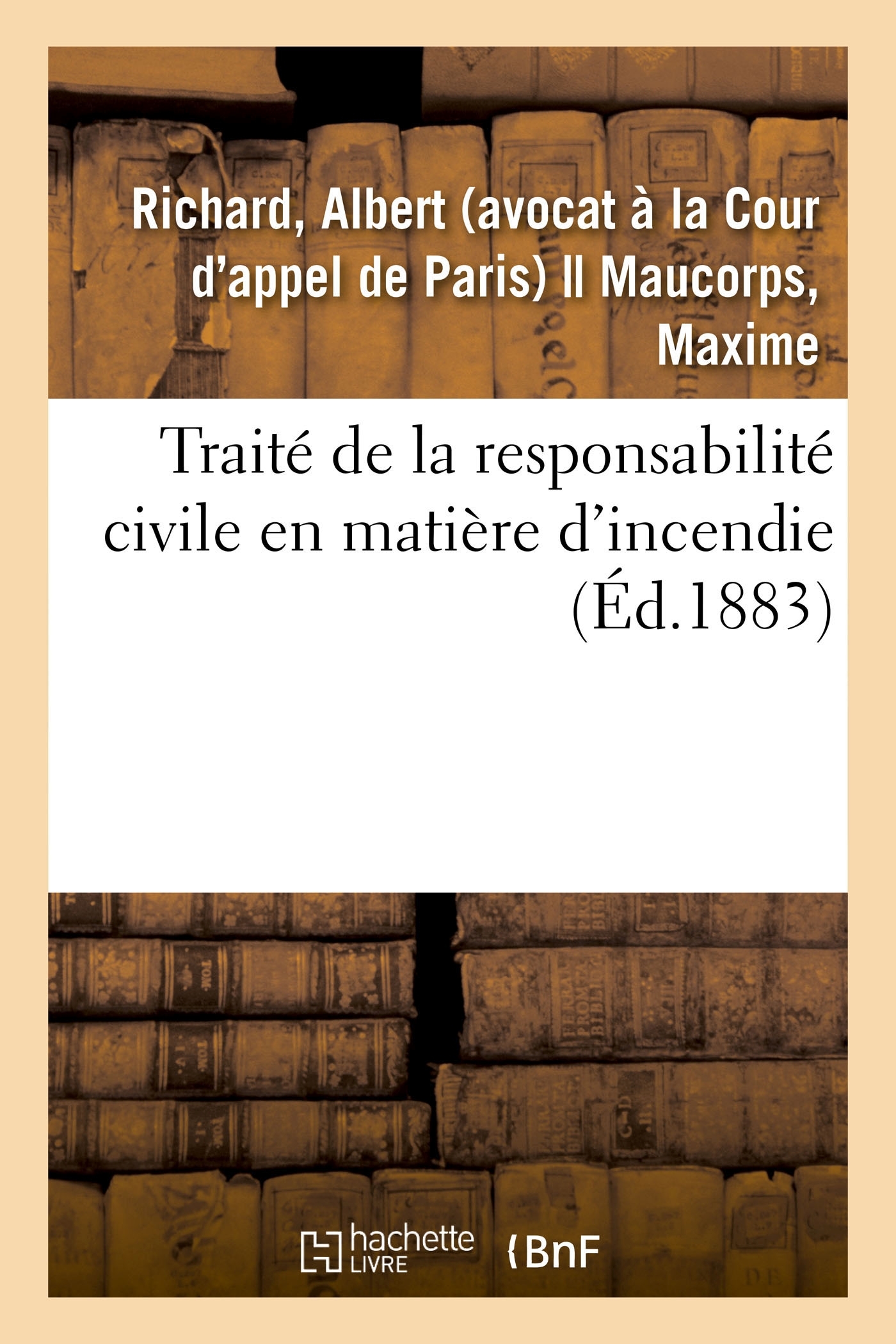 Traité de la responsabilité civile en matière d'incendie, par Albert Richard,... et Maxime Maucorps,... Date de l'édition originale : 1883 Le présent ouvrage s'inscrit dans une politique de conservation patrimoniale des ouvrages de la littérature Française mise en place avec la BNF. HACHETTE LIVRE et la BNF proposent ainsi un catalogue de titres indisponibles, la BNF ayant numérisé ces oeuvres et HACHETTE LIVRE les imprimant à la demande. Certains de ces ouvrages reflètent des courants de pensée caractéristiques de leur époque, mais qui seraient aujourd'hui jugés condamnables. Ils n'en appartiennent pas moins à l'histoire des idées en France et sont susceptibles de présenter un intérêt scientifique ou historique. Le sens de notre démarche éditoriale consiste ainsi à permettre l'accès à ces oeuvres sans pour autant que nous en cautionnions en aucune façon le contenu. Pour plus d'informations, rendez-vous sur www.hachettebnf.fr