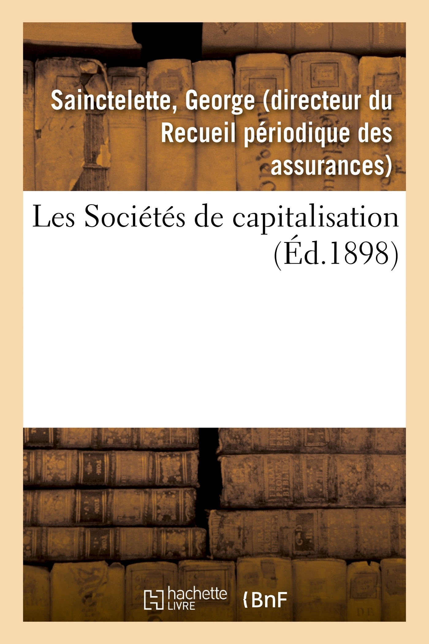 Les Sociétés de capitalisation, par G. Sainctelette,... Date de l'édition originale : 1898 Le présent ouvrage s'inscrit dans une politique de conservation patrimoniale des ouvrages de la littérature Française mise en place avec la BNF. HACHETTE LIVRE et la BNF proposent ainsi un catalogue de titres indisponibles, la BNF ayant numérisé ces oeuvres et HACHETTE LIVRE les imprimant à la demande. Certains de ces ouvrages reflètent des courants de pensée caractéristiques de leur époque, mais qui seraient aujourd'hui jugés condamnables. Ils n'en appartiennent pas moins à l'histoire des idées en France et sont susceptibles de présenter un intérêt scientifique ou historique. Le sens de notre démarche éditoriale consiste ainsi à permettre l'accès à ces oeuvres sans pour autant que nous en cautionnions en aucune façon le contenu. Pour plus d'informations, rendez-vous sur www.hachettebnf.fr