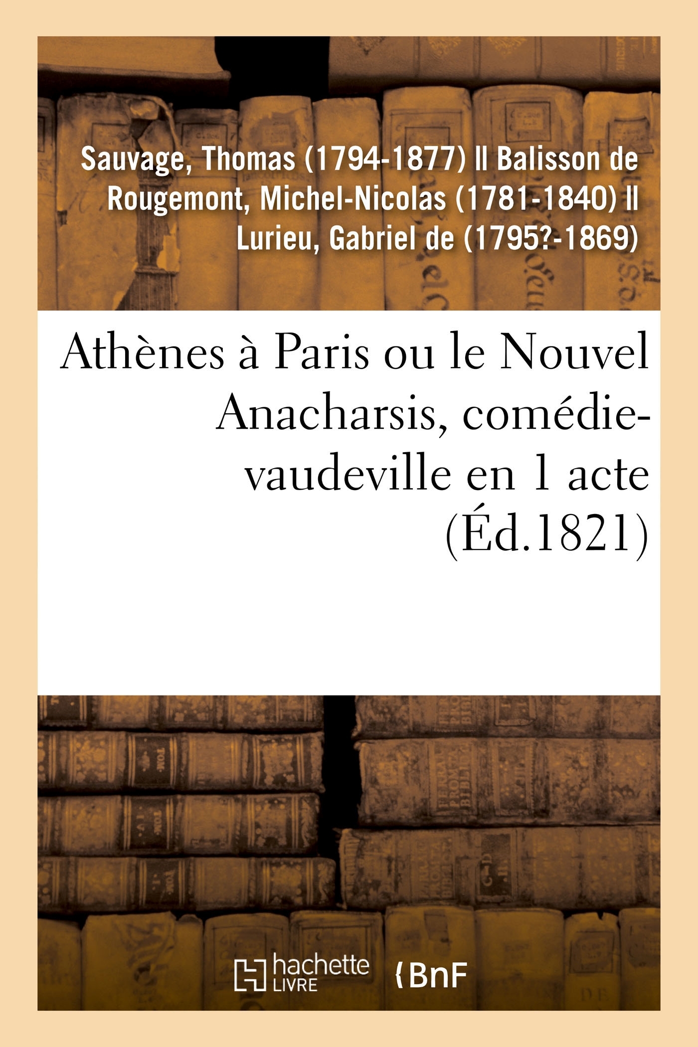 Athènes à Paris, ou le Nouvel Anacharsis, comédie-vaudeville en 1 acte, par MM. de Rougemont, Gabriel et Sauvage... [Paris, Variétés, 1er décembre 1821.] Date de l'édition originale : 1821 Le présent ouvrage s'inscrit dans une politique de conservation patrimoniale des ouvrages de la littérature Française mise en place avec la BNF. HACHETTE LIVRE et la BNF proposent ainsi un catalogue de titres indisponibles, la BNF ayant numérisé ces oeuvres et HACHETTE LIVRE les imprimant à la demande. Certains de ces ouvrages reflètent des courants de pensée caractéristiques de leur époque, mais qui seraient aujourd'hui jugés condamnables. Ils n'en appartiennent pas moins à l'histoire des idées en France et sont susceptibles de présenter un intérêt scientifique ou historique. Le sens de notre démarche éditoriale consiste ainsi à permettre l'accès à ces oeuvres sans pour autant que nous en cautionnions en aucune façon le contenu. Pour plus d'informations, rendez-vous sur www.hachettebnf.fr