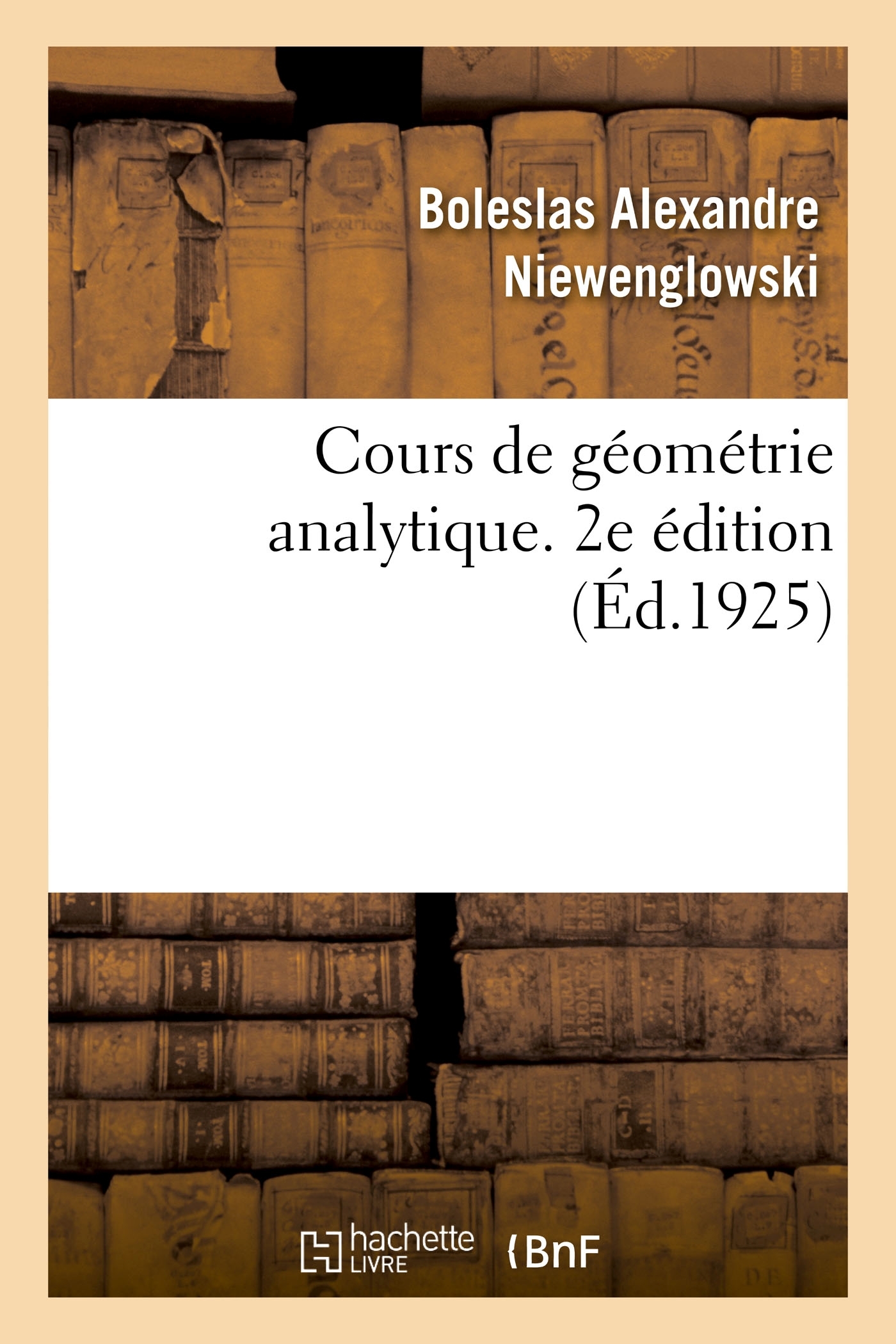 Cours de géométrie analytique, à l'usage des élèves de la classe de mathématiques spéciales, des candidats aux écoles du gouvernement et des candidats à l'agrégation des sciences mathématiques, par B. Niewenglowski,... 2e édition... Date de l'édition originale : 1925-1929 Le présent ouvrage s'inscrit dans une politique de conservation patrimoniale des ouvrages de la littérature Française mise en place avec la BNF. HACHETTE LIVRE et la BNF proposent ainsi un catalogue de titres indisponibles, la BNF ayant numérisé ces oeuvres et HACHETTE LIVRE les imprimant à la demande. Certains de ces ouvrages reflètent des courants de pensée caractéristiques de leur époque, mais qui seraient aujourd'hui jugés condamnables. Ils n'en appartiennent pas moins à l'histoire des idées en France et sont susceptibles de présenter un intérêt scientifique ou historique. Le sens de notre démarche éditoriale consiste ainsi à permettre l'accès à ces oeuvres sans pour autant que nous en cautionnions en aucune façon le contenu. Pour plus d'informations, rendez-vous sur www.hachettebnf.fr