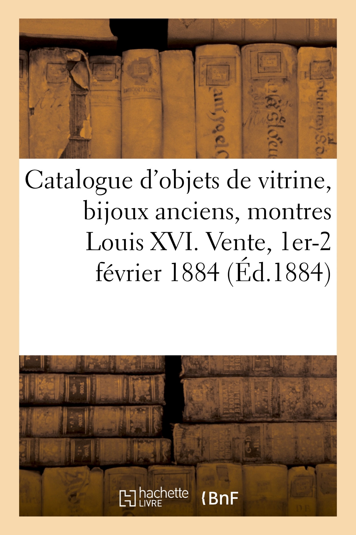 Catalogue des objets de vitrine, bijoux anciens, montres Louis XVI..., objets variés... vente... 1er et... 2 février 1884 / [expert] Charles Mannheim Date de l'édition originale : 1884 Le présent ouvrage s'inscrit dans une politique de conservation patrimoniale des ouvrages de la littérature Française mise en place avec la BNF. HACHETTE LIVRE et la BNF proposent ainsi un catalogue de titres indisponibles, la BNF ayant numérisé ces oeuvres et HACHETTE LIVRE les imprimant à la demande. Certains de ces ouvrages reflètent des courants de pensée caractéristiques de leur époque, mais qui seraient aujourd'hui jugés condamnables. Ils n'en appartiennent pas moins à l'histoire des idées en France et sont susceptibles de présenter un intérêt scientifique ou historique. Le sens de notre démarche éditoriale consiste ainsi à permettre l'accès à ces oeuvres sans pour autant que nous en cautionnions en aucune façon le contenu. Pour plus d'informations, rendez-vous sur www.hachettebnf.fr