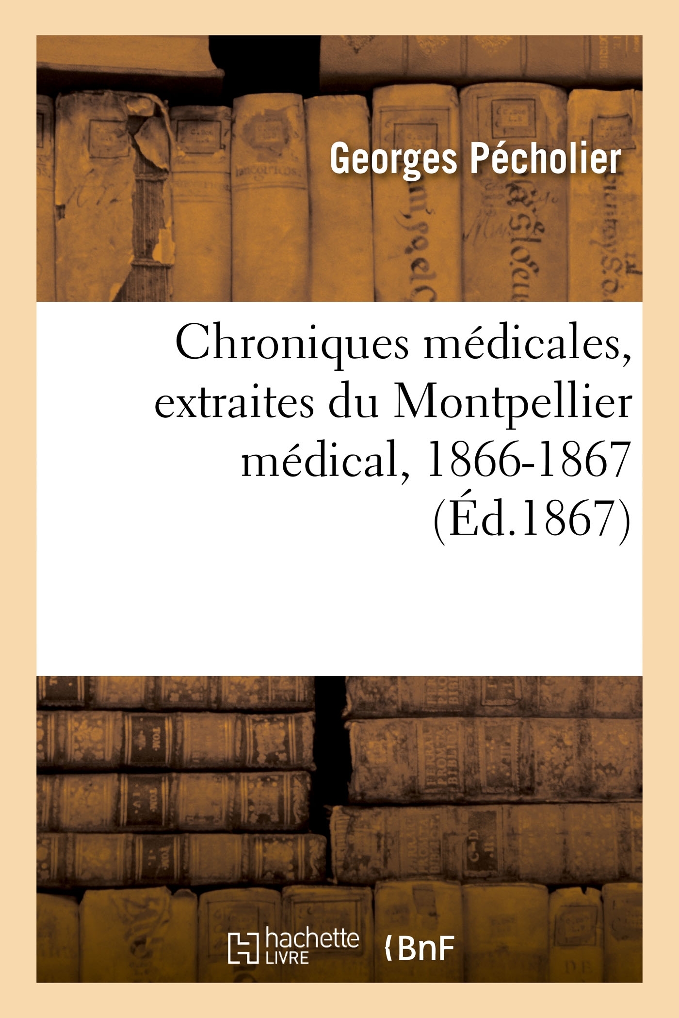 Chroniques médicales, extraites du "Montpellier médical, janvier, octobre, novembre, décembre 1866 ; janvier 1867", par G. Pécholier,... Date de l'édition originale : 1867 Le présent ouvrage s'inscrit dans une politique de conservation patrimoniale des ouvrages de la littérature Française mise en place avec la BNF. HACHETTE LIVRE et la BNF proposent ainsi un catalogue de titres indisponibles, la BNF ayant numérisé ces oeuvres et HACHETTE LIVRE les imprimant à la demande. Certains de ces ouvrages reflètent des courants de pensée caractéristiques de leur époque, mais qui seraient aujourd'hui jugés condamnables. Ils n'en appartiennent pas moins à l'histoire des idées en France et sont susceptibles de présenter un intérêt scientifique ou historique. Le sens de notre démarche éditoriale consiste ainsi à permettre l'accès à ces oeuvres sans pour autant que nous en cautionnions en aucune façon le contenu. Pour plus d'informations, rendez-vous sur www.hachettebnf.fr